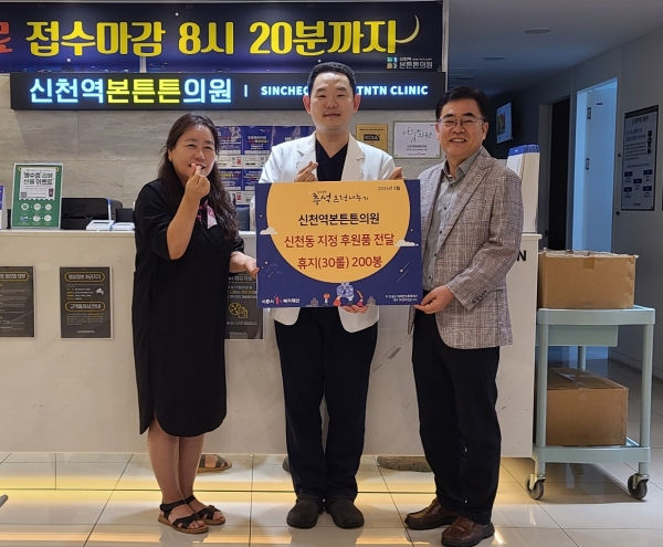 [금요저널] 시흥시 신천동 행정복지센터는 지난 5일 신천역 본튼튼의원으로부터 추석맞이 후원품인 휴지 200묶음을 전달받았다.