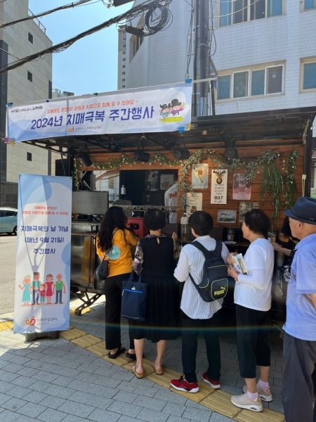 건강음료를 함께 나누며 치매극복을 위한 공감대를 형성하고 현수막과 홍보지, 건강음료 컵걸이 문구 등을 활용해 치매관리의 중요성을 홍보했다.