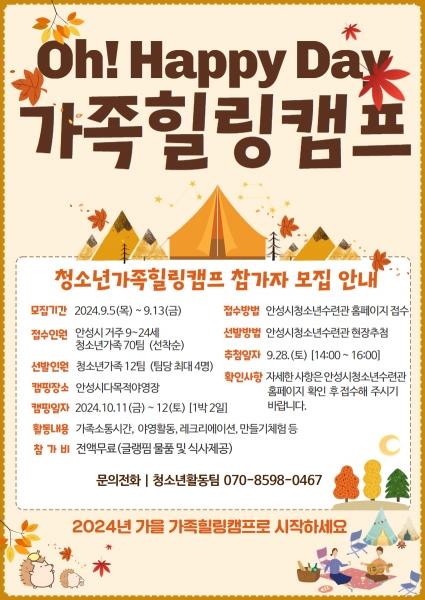 ‘가족힐링캠프’는 부모와 자녀로 이루어진 가족이 함께 참여할 수 있는 프로그램으로 자연 속에서 휴식과 소통으로 즐거운 추억을 만들 수 있도록 10월 12일부터 13일까지 1박 2일간 안성시 다목적야영장에서 진행된다.