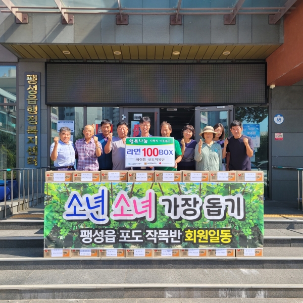 팽성읍장은 “포도작목반의 따뜻한 기부 덕분에 이번 추석 명절이 저소득층 가구에 더욱 풍성하고 의미 있는 시간이 될 것이다 기부된 라면은 저소득층 가구에 신속하게 잘 전달될 것이며 앞으로도 지속적인 지원과 나눔이 이어지기를 기대한다”고 밝혔다.