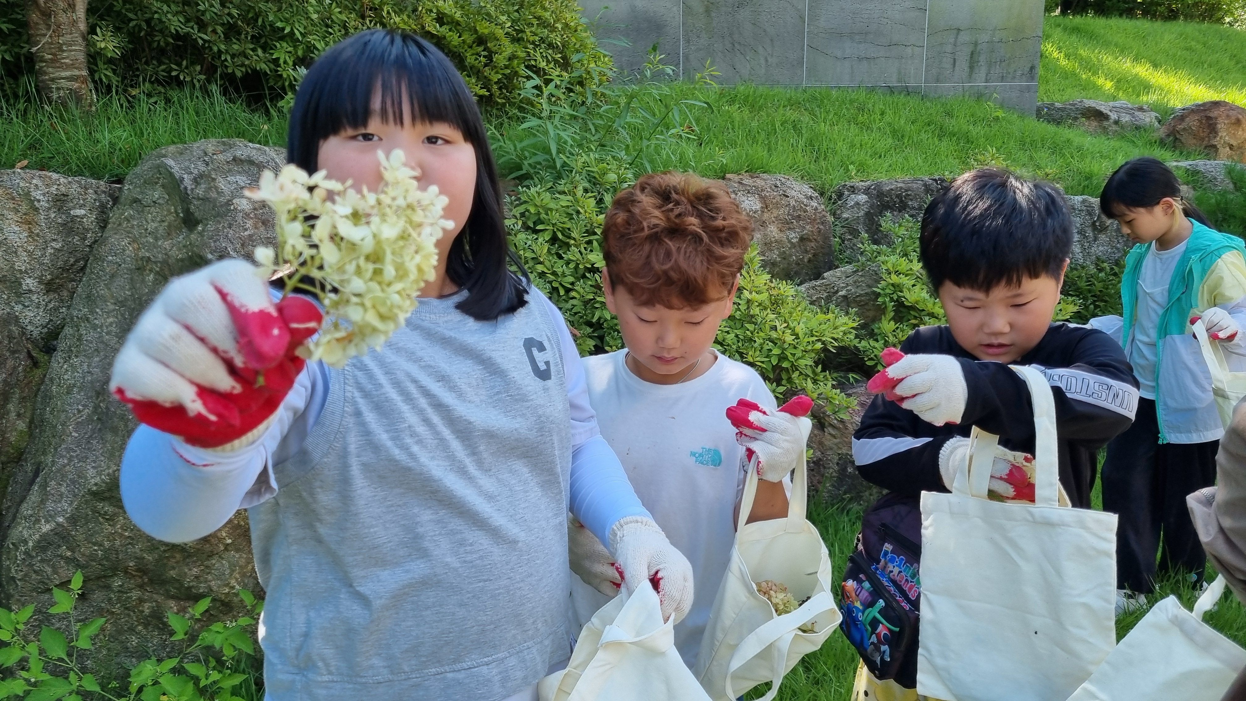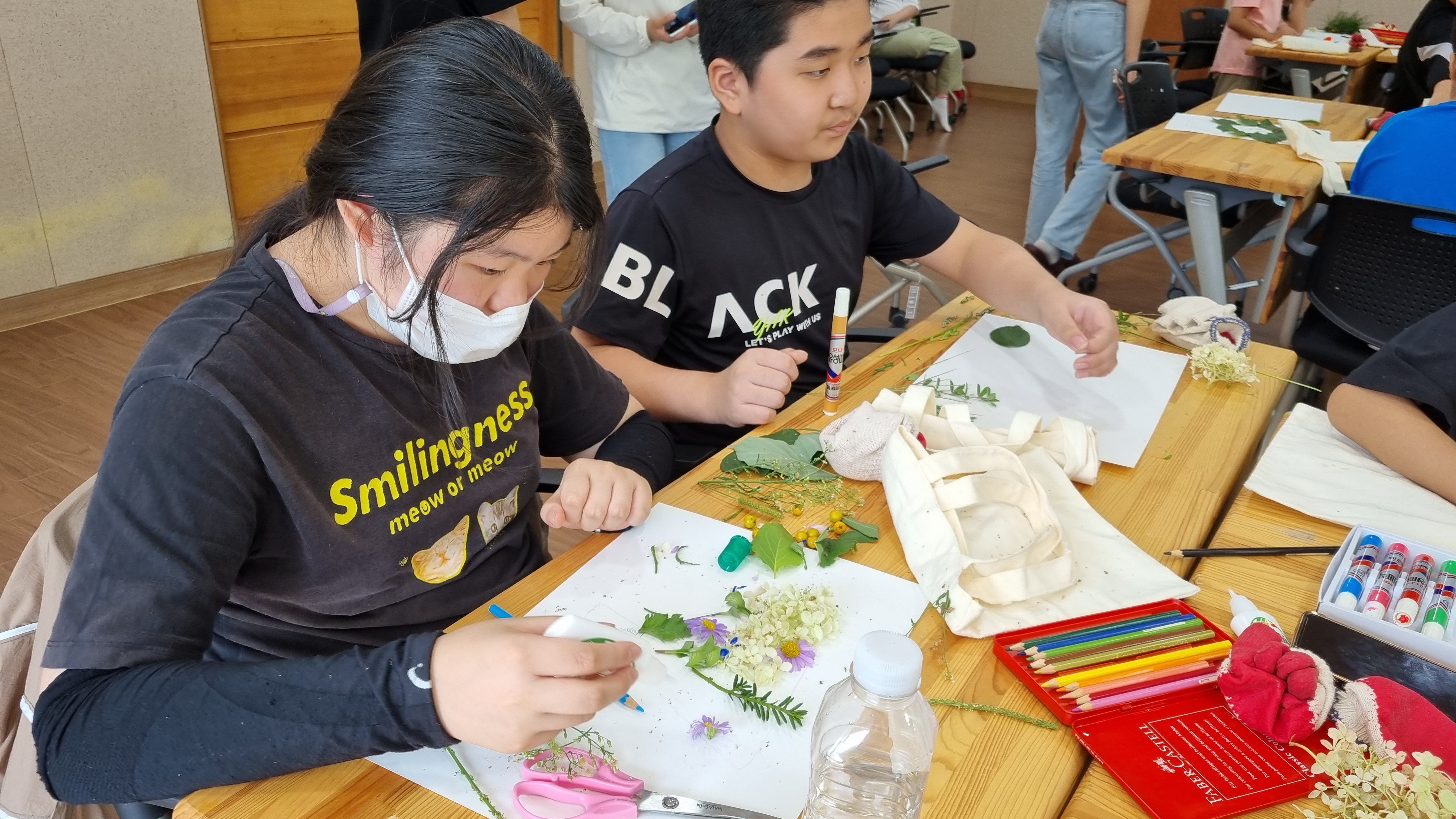 오전시간에는 체험관 곳곳에 있는 풀과 나무, 꽃에 대해 강사님의 설명을 들으며 산책로를 걸었고, 산책 도중에 발견한 다양한 자연물(잎사귀, 열매, 꽃 등)을 채취했다. 이 자연물들은 학생들이 자신만의 독창적인 작품을 만드는 데 활용되었다.