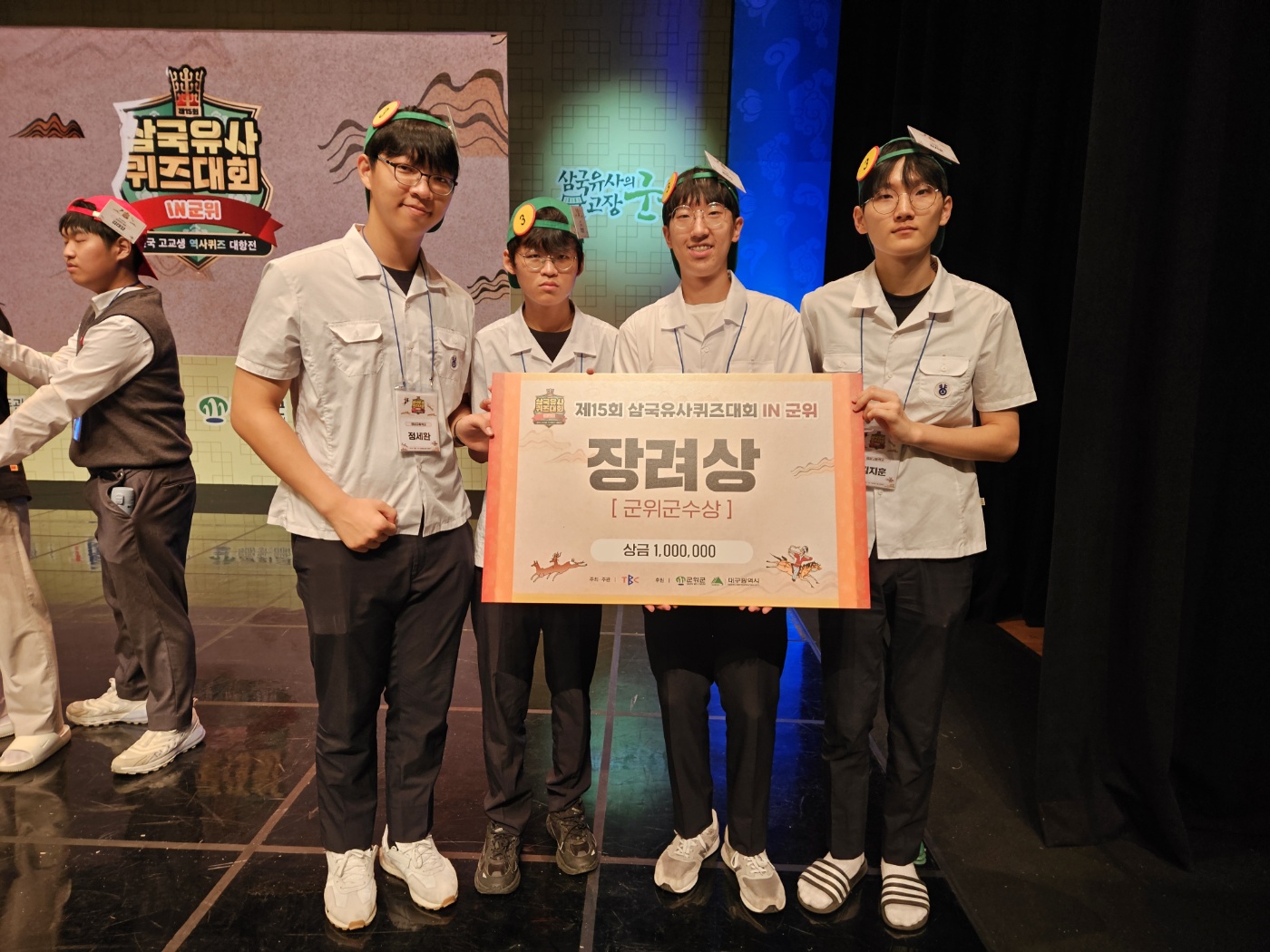 영양고등학교(교장 신현준)는 7일부터 8일까지 군위군에서 개최된 제15회 삼국유사 퀴즈대회에 1학년 권언수, 박성민, 2학년 김지훈, 정세환 학생이 참가하여 최종 4위로 장려상(군위군수상, 상금 1,000,000원)을 수상하는 쾌거를 이루어내었다.