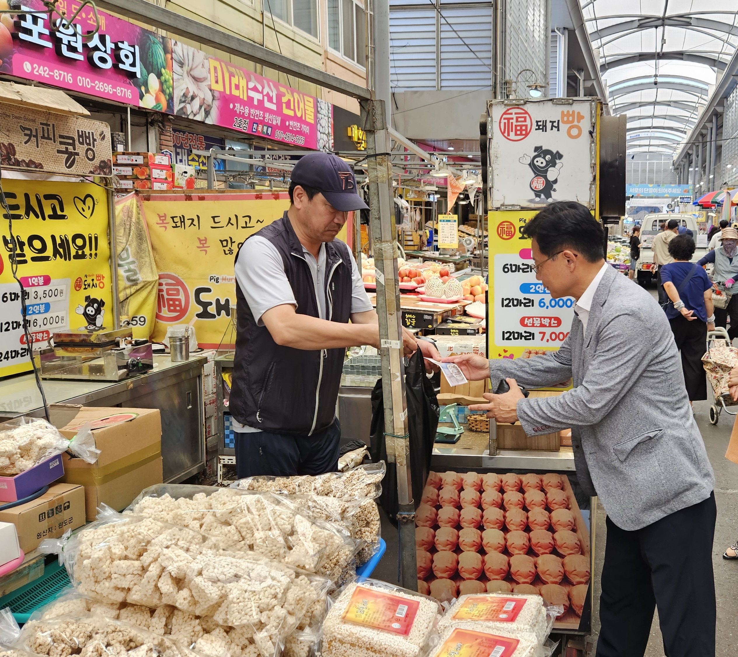 ☐ 최한용 교육장은 “고금리 고물가 시대에 명절 제수용품은 전통시장에서 준비하는 것이 가정경제에 도움이 될 것”이라면서, “신선한 먹거리와 따뜻한 인정이 넘치는 전통시장을 자주 이용해 주길 바란다.”며 전통시장 이용 활성화를 당부했다.