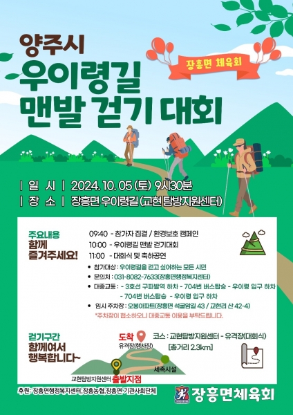 [금요저널] 양주시가 장흥면체육회에서 시민 건강 증진 및 우이령 홍보를 위해 ‘2024년 장흥면 우이령 맨발 걷기대회’를 오는 10월 5일 개최한다고 밝혔다.