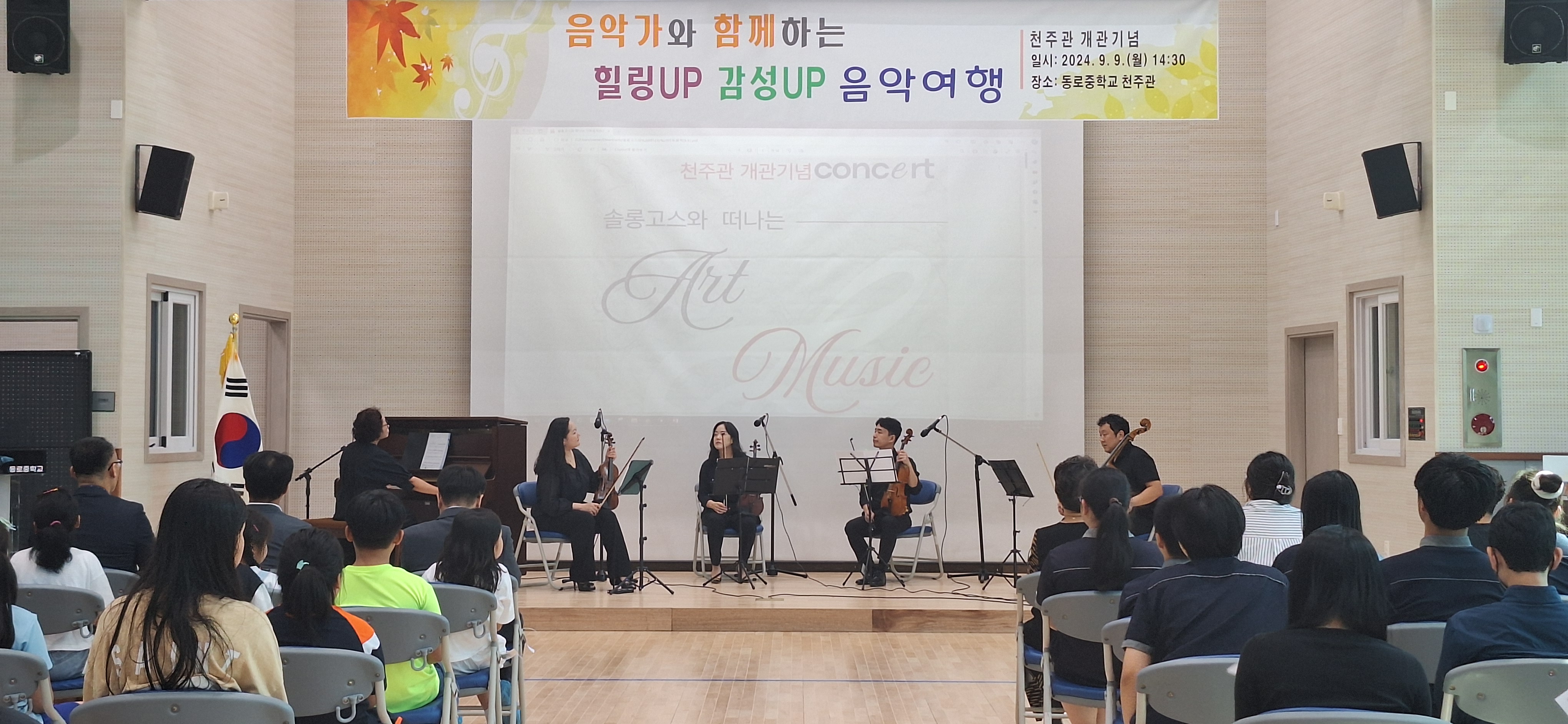 □ 식전 행사로 동로중학교 학생회에서 동로초등학교 동생들을 위해 준비한 퀴즈가 진행되었고, 테이프 커팅식과 개관을 축하하는 음악회로 마무리되었다. 음악회에서는 천주관을 가득 채운 솔롱고스콰르텟의 피아노 5중주, 소프라노 김태인과 테너 현동헌의 노래와 연희집단 오락 사물놀이 공연이 천주관의 신명나는 개관을 알렸다. 이번 음악회는 개관식에 참여한 학생, 학부모, 지역주민이 함께 어울려 모든 이들의 마음이 흡족하게 채워진 행복하고 따뜻한 시간이었다.