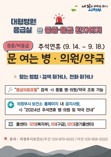 한편 추석 연휴에 방문할 수 있는 가장 가까운 응급실, 문여는 의료기관 및 약국 등은 119, 129, 120으로 전화하거나 응급의료포털 누리집 또는 시청 및 보건소 누리집 공지사항, 스마트폰 앱 ‘응급의료정보제공’에서 확인할 수 있다.