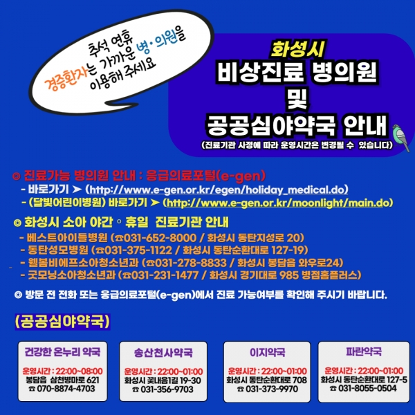 정명근 화성시장은 “응급실의 원활한 운영을 위해 지역주민의 협조가 절실하다”며“경미한 증상의 경우 가까운 동네 병의원과 약국을 이용해 줄 것을 당부드린다”고 말했다한편 시는 시민들이 편리하게 의료기관을 찾을 수 있도록 연휴기간 운영하는 병·의원과 약국 정보를 시 보건소 홈페이지와 SNS, 문자메시지를 통해 제공할 예정이며 응급상황 시에는 응급의료포털 및‘응급의료정보제공’앱을 통해서도 연휴기간 운영하는 응급실과 병·의원 정보를 확인할 수 있다.