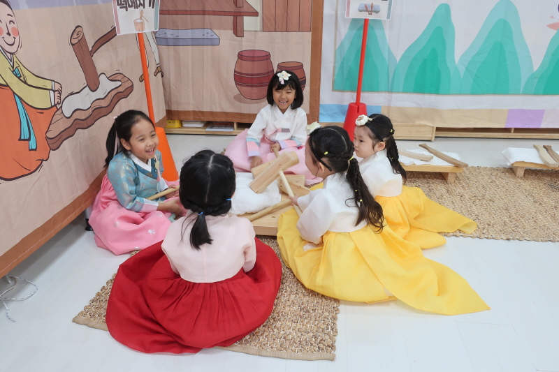 ▣ 한복을 입고 등교하는 자녀를 보던 학부모는 “한복을 입은 아이들의 모습이 너무 예쁘다.”고 말하며 “요즘 아이들은 태권도 학원 같은 곳에서나 친구들과 어울릴 기회가 있는데 유치원에서 전통놀이를 통해 다양한 연령대의 아이들이 만날 수 있어서 참 좋다.”며 만족감을 표현했다.