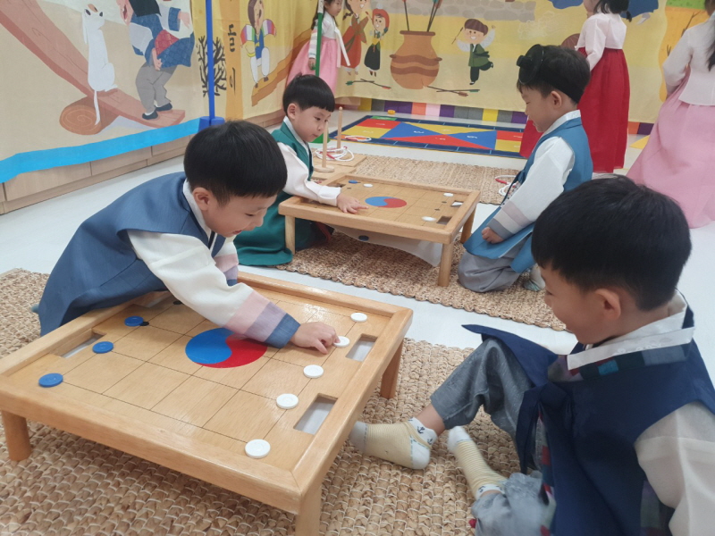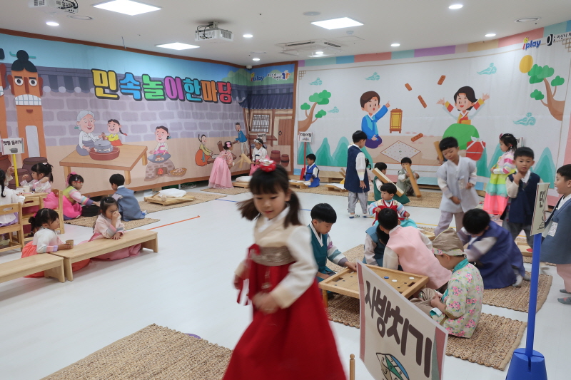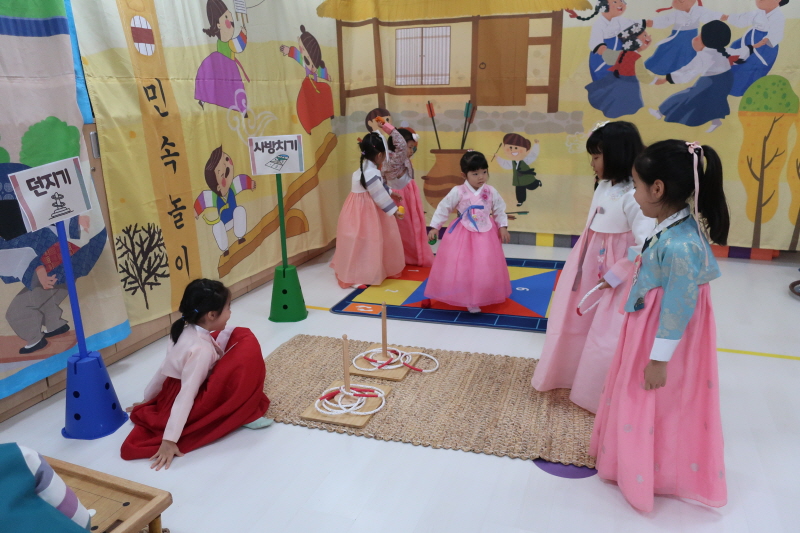 ▣ 아이들은 고운 한복을 입고 친구들과 윷놀이, 사방치기, 알까기, 팽이치기, 투호 등 다채로운 전통놀이를 즐겼다.