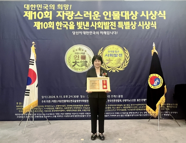 [금요저널] 경기도의회 건설교통위원회 서성란 의원은 9월 11일 한국프레스센터에서 ‘대한민국을 빛낸 제10회 2024 자랑스러운 인물 대상’ 시상식에서 대상을 수상했다.