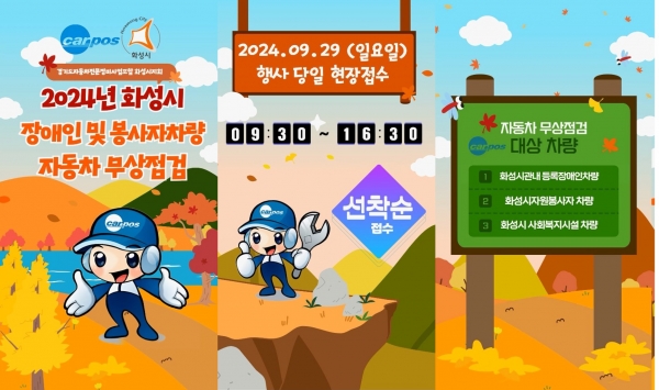 [금요저널] 화성시가 오는 29일 화성종합경기타운 P7 주차장에서 ‘2024년 사회적 약자 자동차 무상 안전점검 행사’를 운영한다.