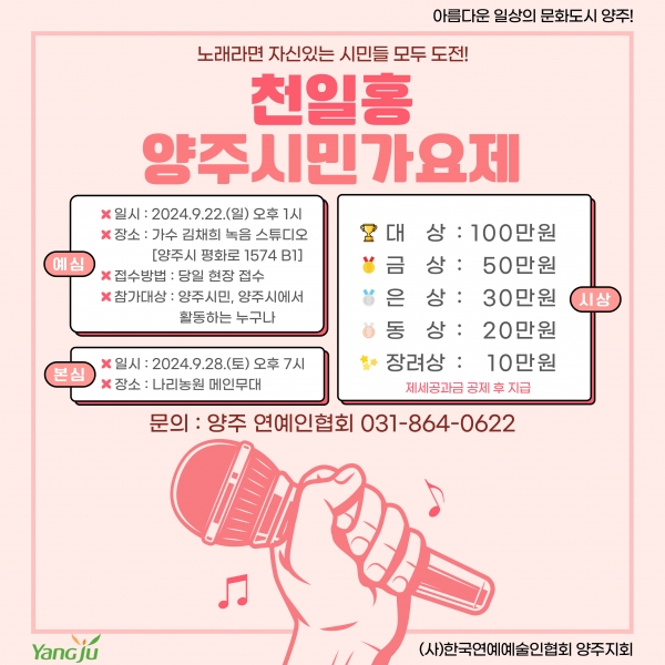 양주시민이나 양주시에서 활동하는 누구나 참가할 수 있는 이번 행사는 예선전은 오늘 22일 당일 현장에서 참가 신청할 수 있으며 오후 1시부터 4시까지 양주시 평화로 1574, 지하 1층[가수 김채희 녹음스튜디오]에서 진행된다.