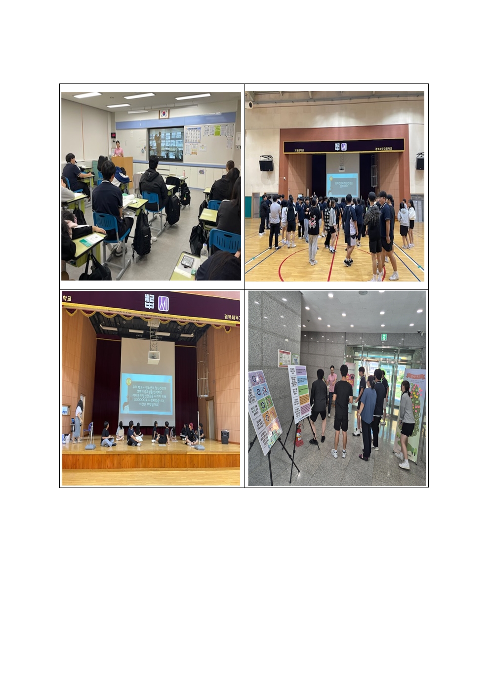 □ 이 주간에 실시한 프로그램은 1학년 대상으로 ‘보고 듣고 말하기’생명지킴이 대면교육을 학급별로 실시하였고, 전교생 및 교직원 대상 마음건강 골든벨 퀴즈대회 및 점심시간을 이용한 생명존중 캠패인등 다채롭게 진행되었다.