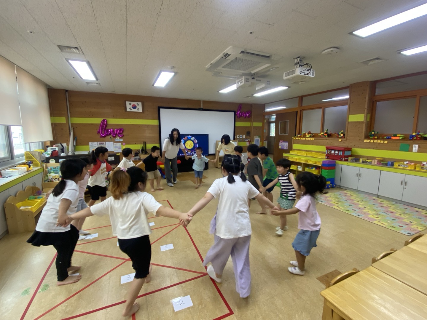 ◇ 우리나라 명절인 추석의 의미를 알아보고 전통으로 내려오는 음식, 놀이, 풍습에 대해 이야기를 나누었다. 전통문화에 관심을 가지고 자긍심을 가질 수 있는 제기차기와 비석치기, 투호놀이, 사방치기, 딱지치기, 팽이돌리기, 대형 윷놀이 등 다양한 체험활동으로 진행하였다. 특히 강강술래를 하며 유아들이 한마음으로 단합하여 진행하는 모습을 보여주기도 했다.