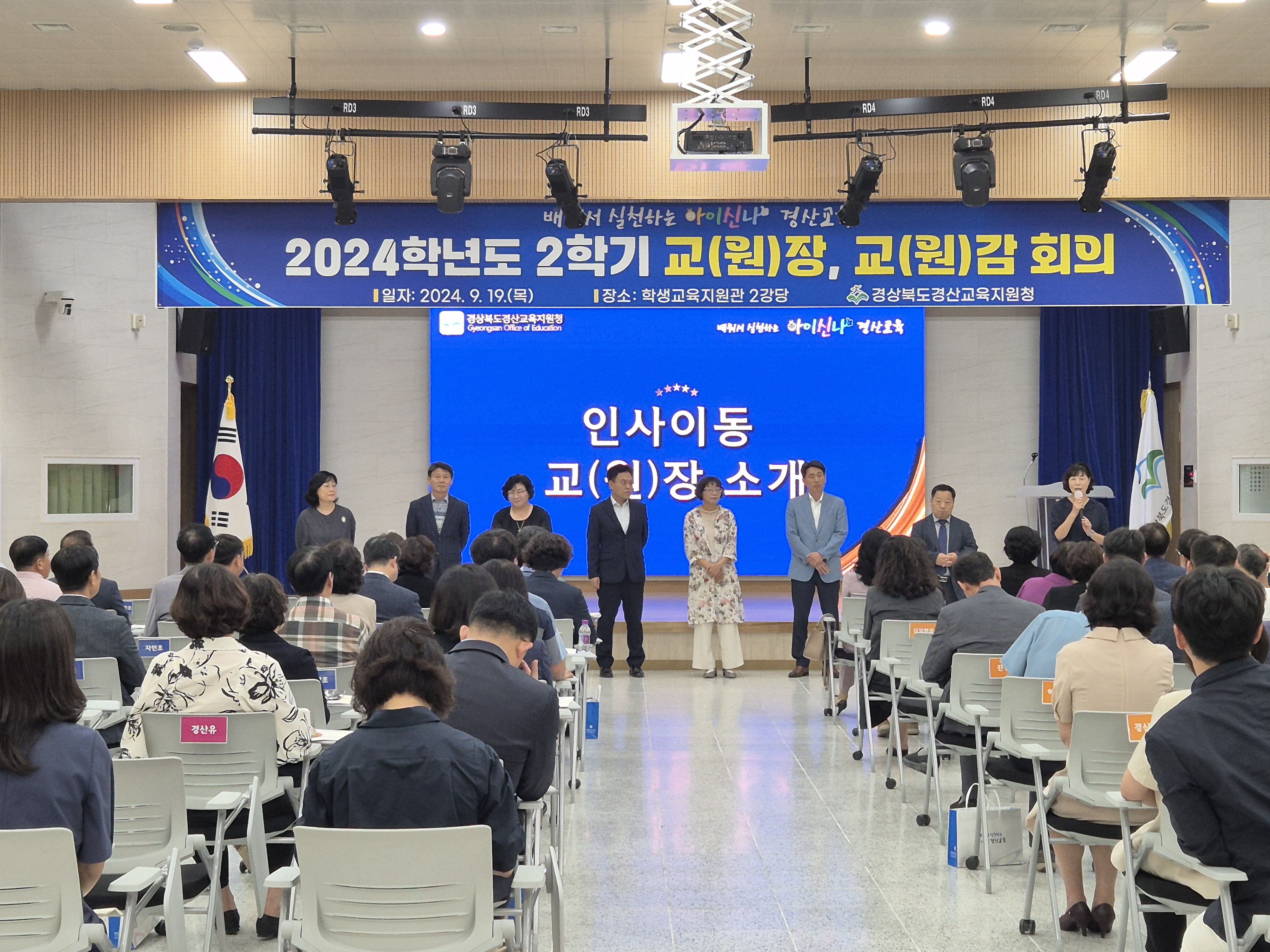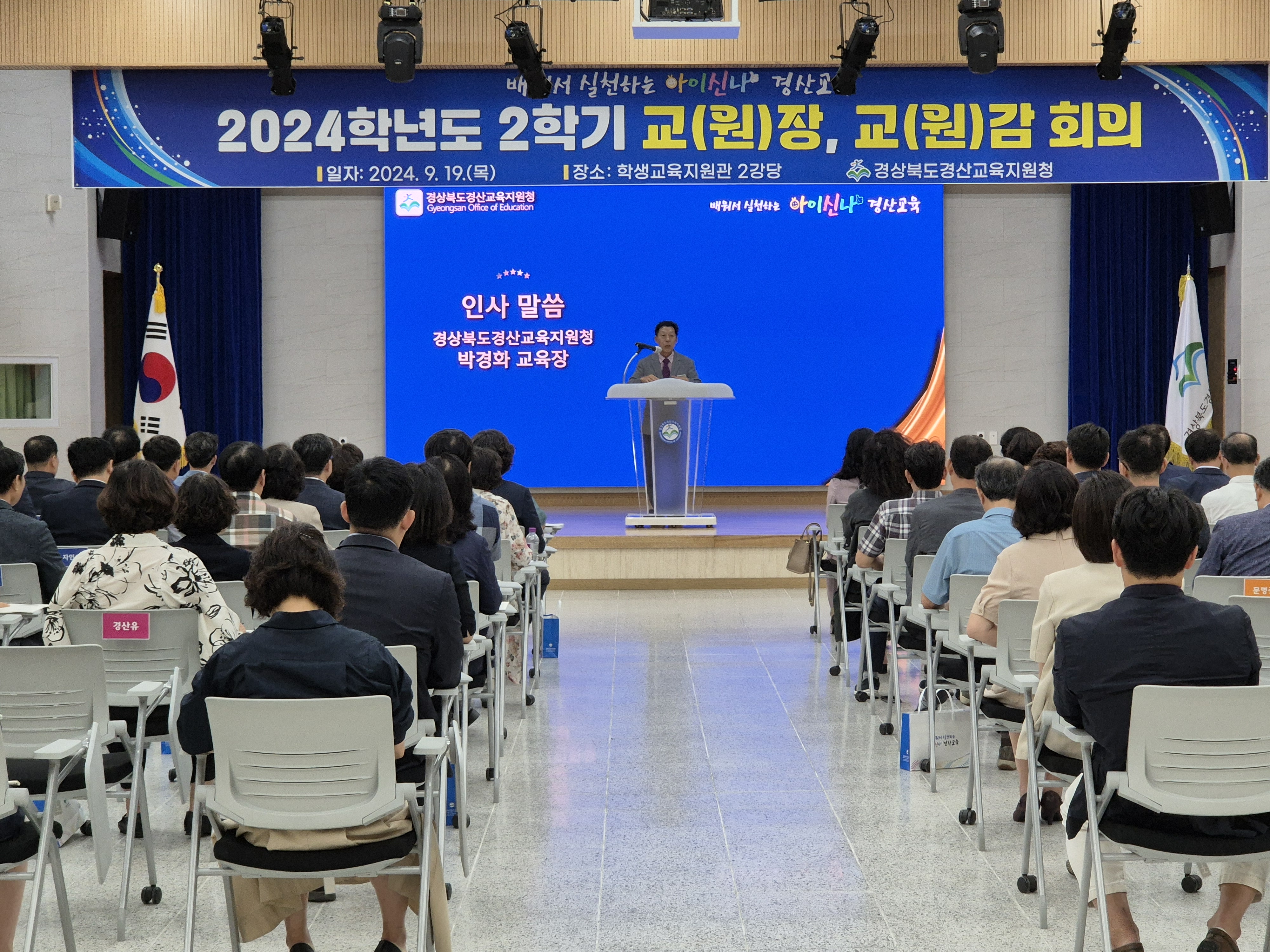□ 경상북도경산교육지원청(교육장 박경화)은 9월 19일(목)에 학생교육지원관 2강당에서 유, 초, 중, 고, 특수, 각종학교 교(원)장 및 교(원)감을 대상으로 2024학년도 2학기 회의를 개최하였다.