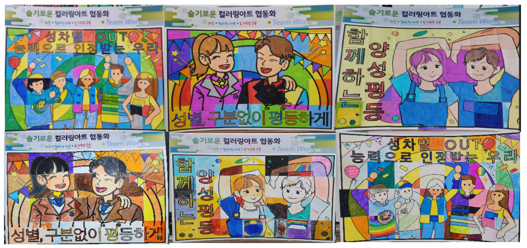 □ 9월 9일(월)부터 9월 13일(금)까지 양성평등 교육활동 주간 동안 학급별로 학생들에게 홍보 및 교육을 하고, 양성평등 관련 협동화 작품을 완성한 후 교실 게시판에 전시하도록 하여 양성평등 의식을 높일 수 있도록 하였다. 더불어 양성평등 관련 교직원 연수와 가정통신문을 통한 학부모님 양성평등 교육으로 양성평등 문화 확산을 위해 노력하였다.