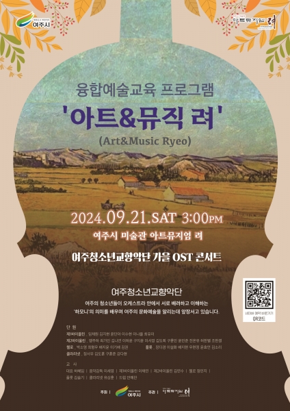 9월 ‘아트&뮤직 려’ 프로그램은 ‘여주청소년교향악단 가을 OST’라는 주제로 프로그램을 구성했으며 여주의 청소년들이 바이올린, 첼로 플루트, 클라리넷 등 다양한 악기로 협주를 진행한다.