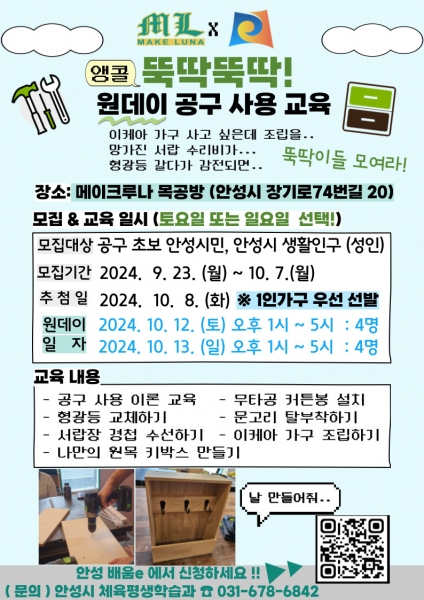 안성시, 뚝딱뚝딱 원데이 공구 사용 교육 참여자 모집