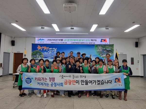 이달 9월은 금광면 청렴 결의 대회의 두 번째 릴레이 행사로 새마을부녀회와 함께 부정부패 없는 청정금광을 만들고자 청렴 슬로건을 선정해 청렴 결의 대회를 실시했다.