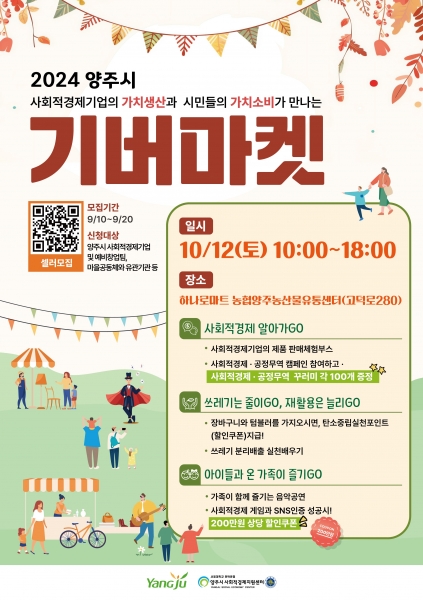 [금요저널] 양주시가 사회적경제기업의 판로지원와 사회적가치에 대한 인식확산을 위해 ‘기버마켓’을 오는 10월 12일 하나로마트 농협양주농산물유통센터에서 진행할 예정이라고 밝혔다.