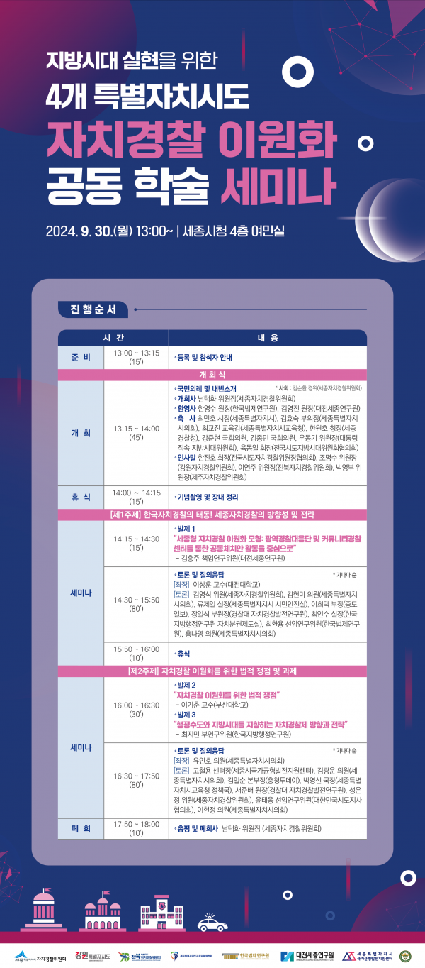 이번 세미나는 세종·강원·전북·제주자치경찰위원회, 한국법제연구원, 대전세종연구원, 세종시 국가균형발전센터, 경찰대학교 자치경찰발전위원회가 주최하고 세종자치경찰위원회, 한국법제연구원, 대전세종연구원, 세종국가균형발전지원센터가 주관한다.