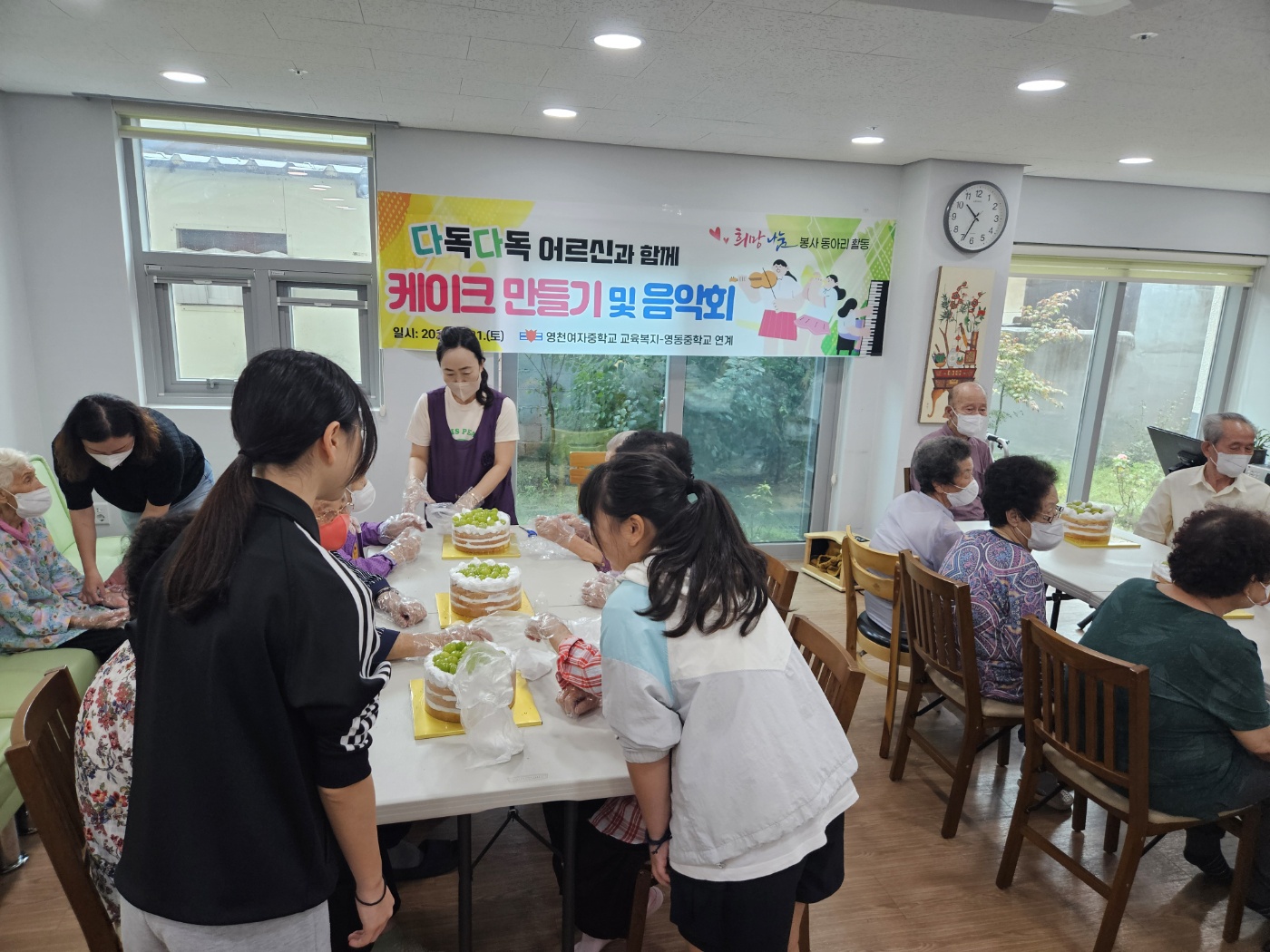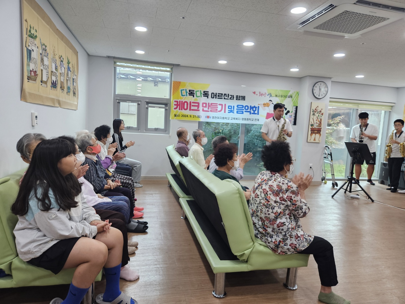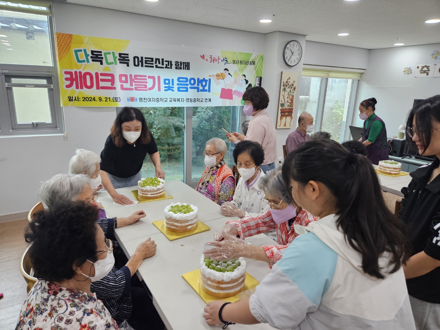 □ 영천여자중학교(교장 박정숙)는 2024년 9월 21일 토요일을 이용하여 2024학년도 함께하는 학생 봉사활동 동아리 공모에 선정되어 1~3학년 희망나눔 봉사 동아리 회원 13명 및 영동중학교 색소폰 동아리와 연계하여 “희망나눔 봉사 동아리 다독다독 어르신과 함께하는 케이크 만들기 및 음악회“를 장수요양원에서 실시하였다.