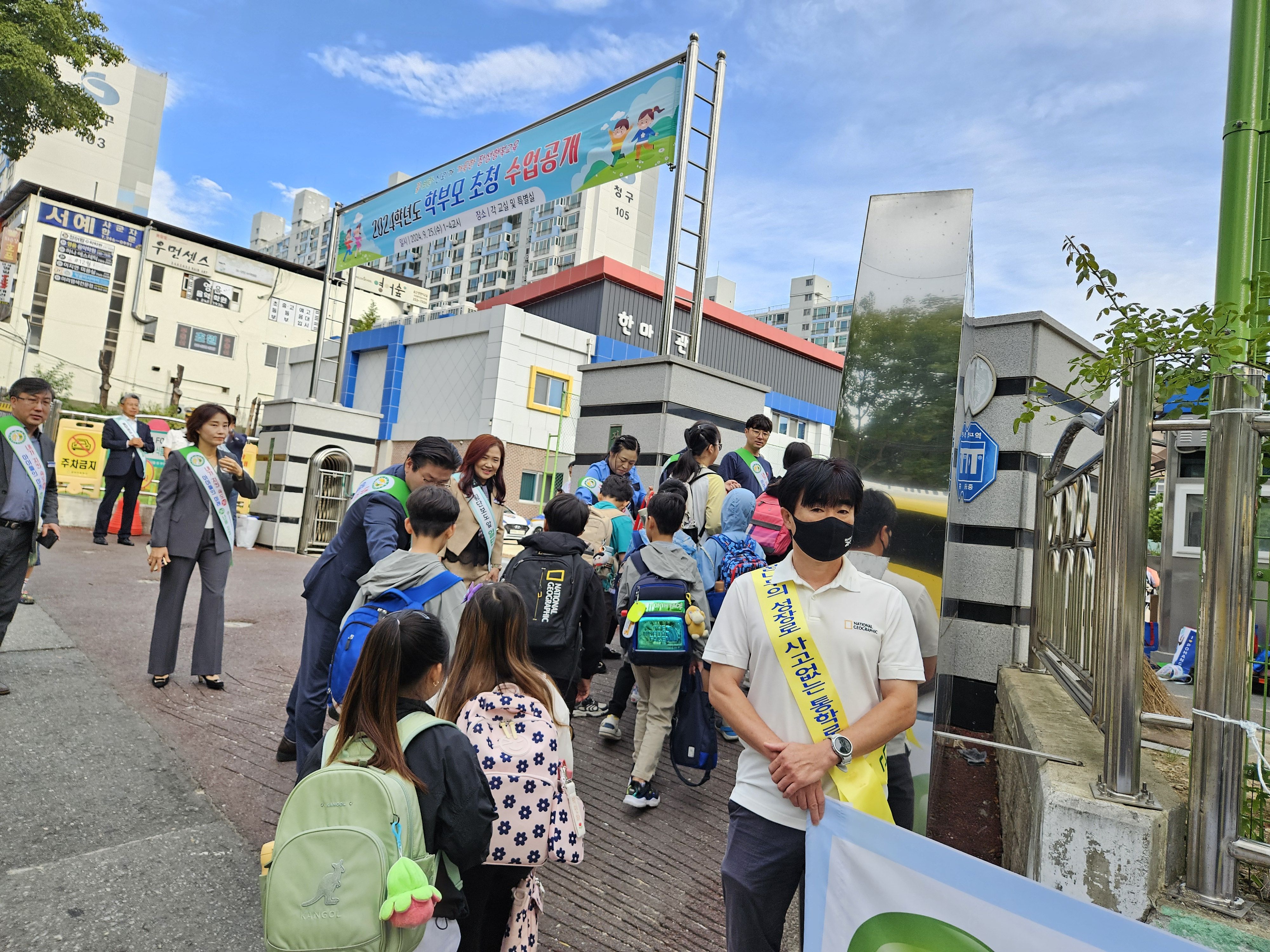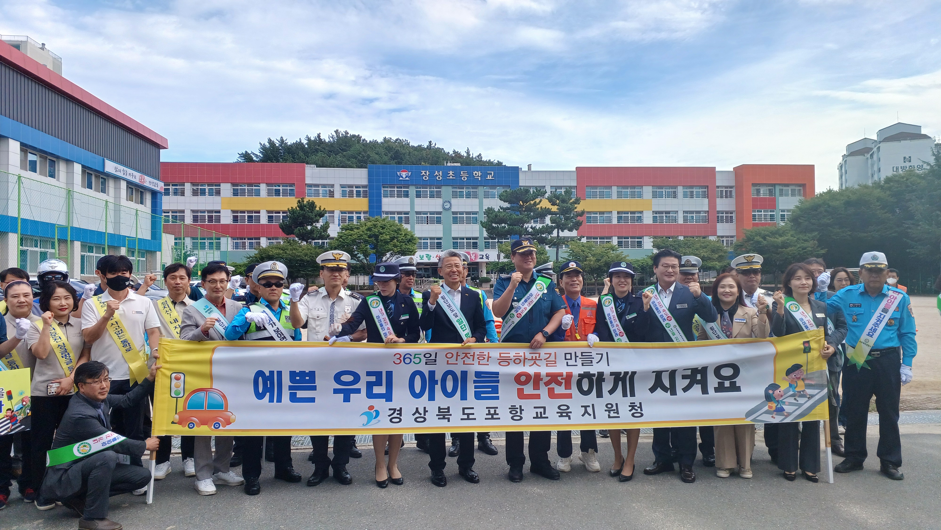장성초등학교(교장 김영선)는 9월 24일(화) 8시부터 8시40분까지 장성초등학교 정문 일대에서 장성초등학교 녹색어머니회, 포항교육지원청, 녹색어머니연합회, 포항북부경찰서, 포항시청, 장성파출소, 모범운전자회, 자율방범대 등 각계 기관 및 교내 학생들과 교원 등 총 80여 명이 함께 ‘학생들의 안전한 등굣길’을 만들기 위한 등굣길 교통안전 합동 캠페인 활동을 펼쳤다.