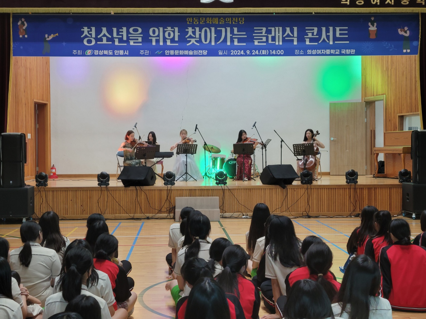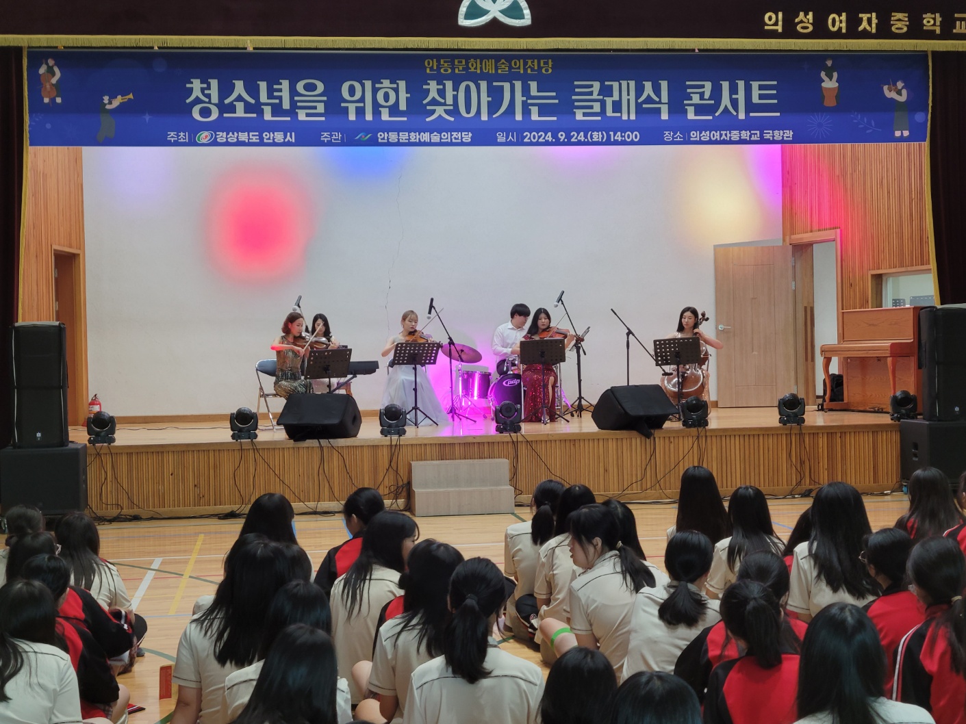 의성여자중학교(교장 최재관)는 2024년 9월 24일(화) 오후 2시, 경상북도와 안동시가 주최하고 안동문화예술의 전당이 주관한 “청소년을 위한 찾아가는 클래식 콘서트”를 성공적으로 마무리하였습니다. 이 행사는 청소년들에게 클래식 음악에 대한 친숙함을 제공하고, 다양한 음악 장르를 클래식으로 재해석한 특별한 공연으로 많은 호응을 얻었습니다.