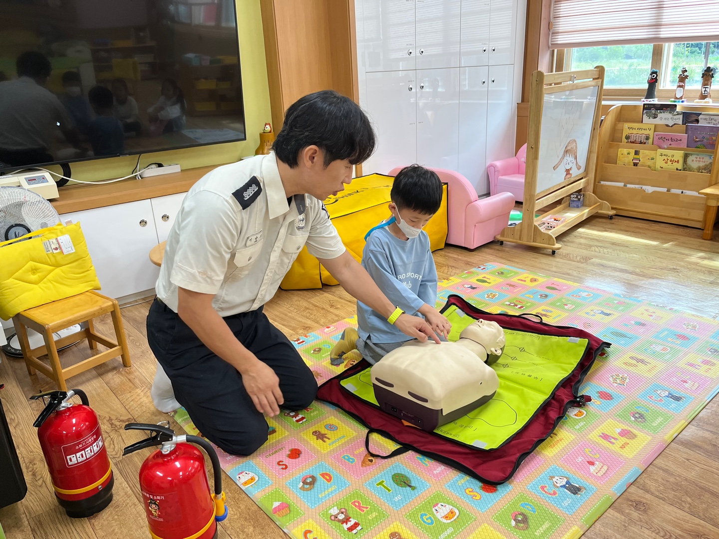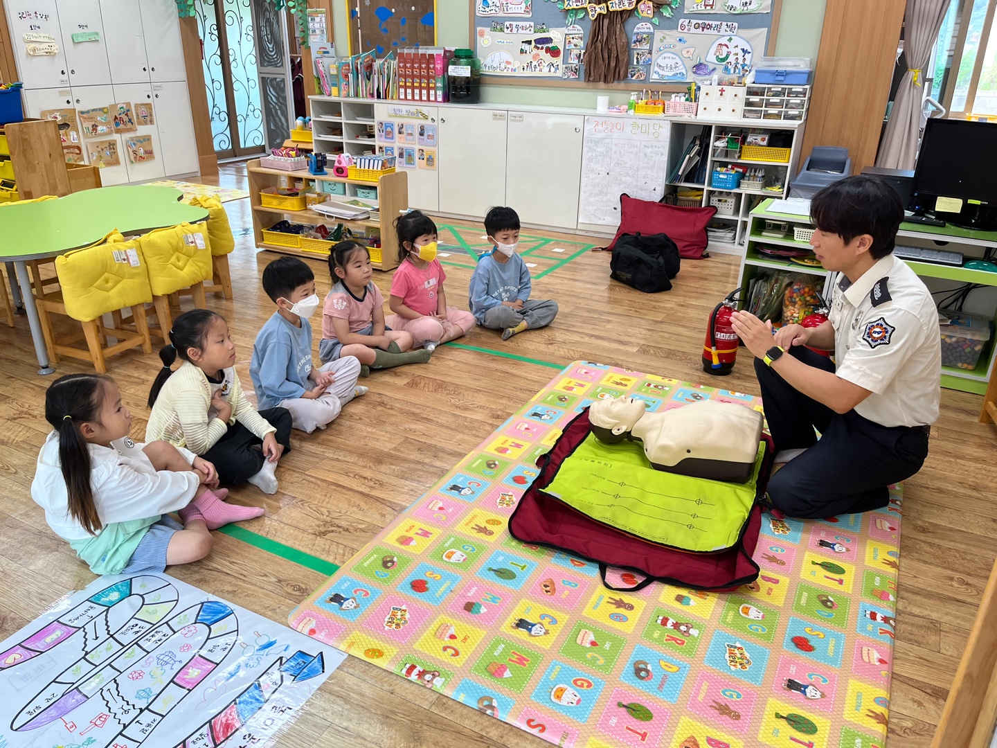 먼저, 소방관과 함께 유아 응급처치 교육을 실시하였다. 유아의 눈높이에 맞는 교육자료를 활용하여 응급상황 대처요령을 알아보고 심폐소생술을 직접 실습해보았다. 심폐소생술 모형 앞에 앉은 유아들은 긴장된 표정으로 소방관의 말에 귀를 기울이며. 하나, 둘 구령에 맞춰 모형을 눌렀다.