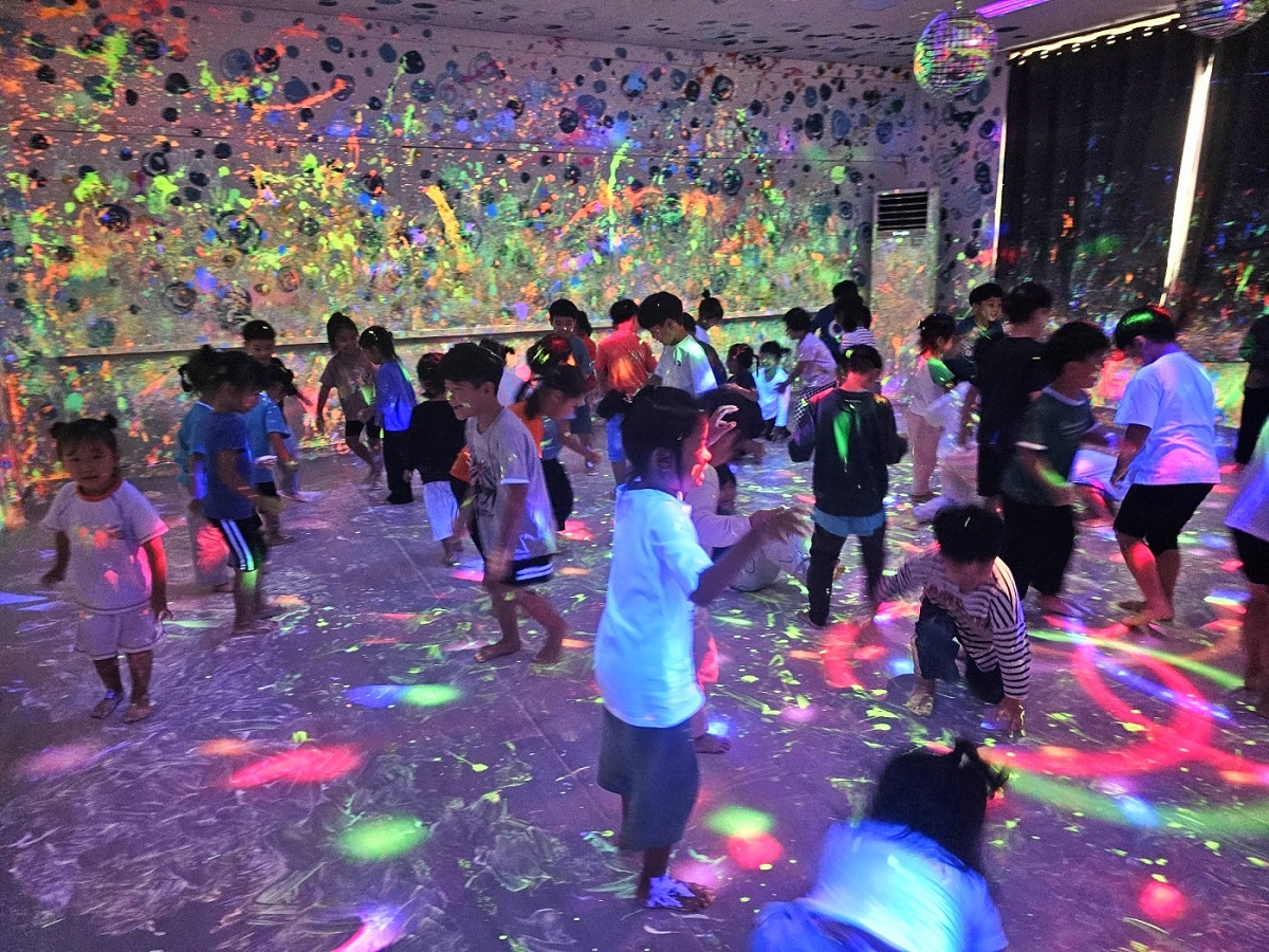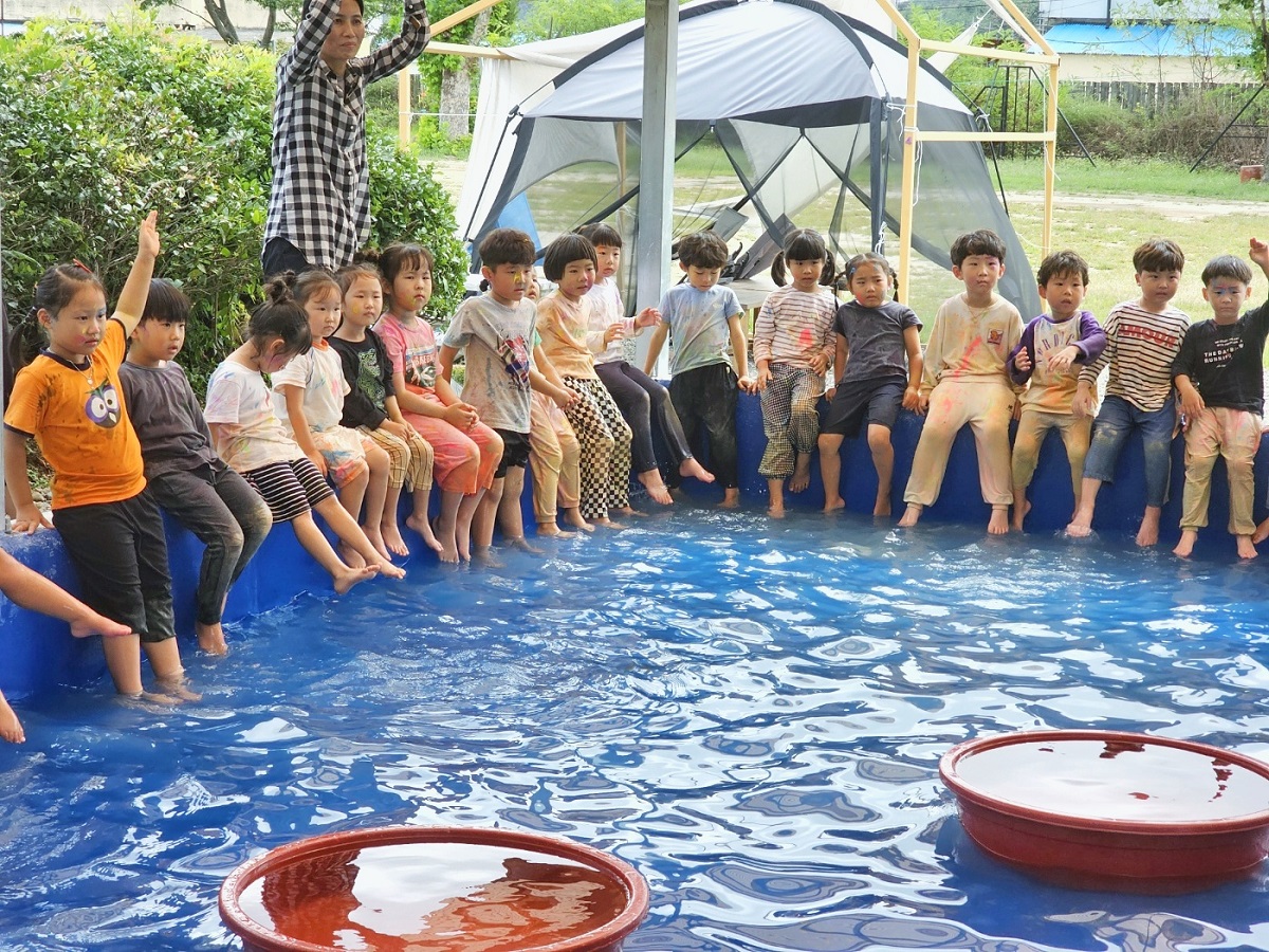 ◇ 점심과 간식을 먹은 후에는 형광물감을 이용한 미술놀이가 이루어졌다. 유아들은 형광 물감을 이용해 자신의 몸, 옷, 바닥 등에 자유롭게 그림을 그리는 시간을 가졌다. 마지막으로 미꾸라지를 잡으며 재미있는 시간을 보냈다.