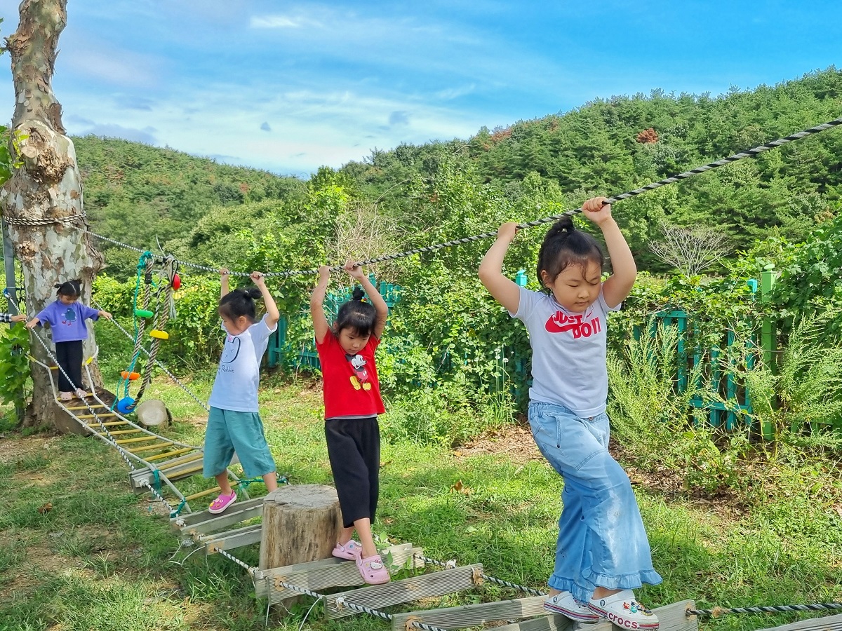 ◇ 숲속놀이터에 도착하여 모험놀이터에서 모래놀이, 흔들다리 건너기, 매달리기 등 자연에서 즐길 수 있는 다양한 놀이를 했다. 김○○ 유아는 “우리 유치원 놀이터랑 다르게 생겼어요.”라며 신기해했다.