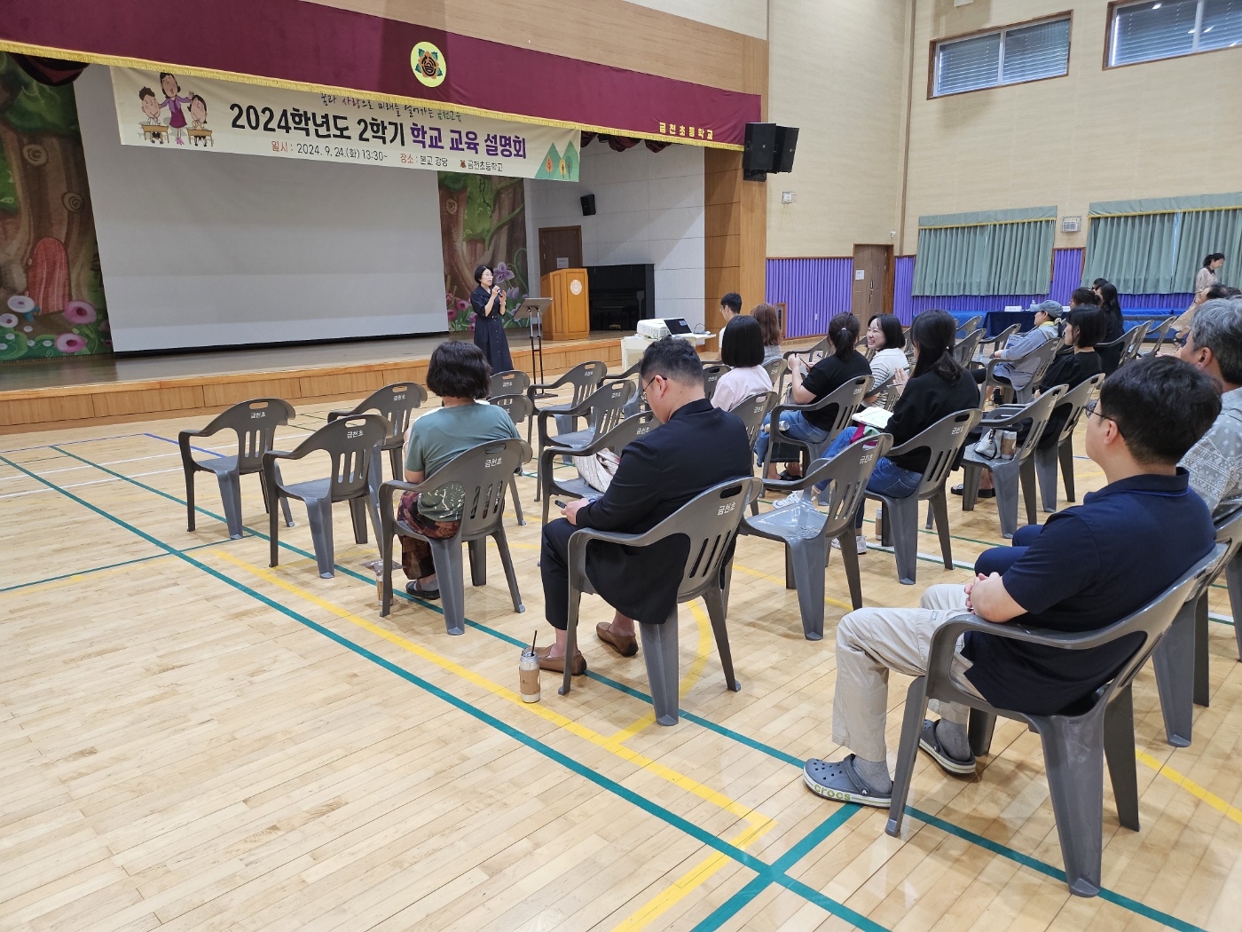 학교 교육설명회에서는 신입 교직원 소개, 1학기 교육활동 영상 시청, 주요 사업 실적 소개를 거쳐 2학기 주요 학사일정, 학교생활기록부 주요사항 안내, 도박예방교육, 자살·자해 예방교육, 화재예방교육, 학교 안전사고 예방교육, 아동학대 및 가정폭력 예방교육, 아동 실종·유괴 예방교육,