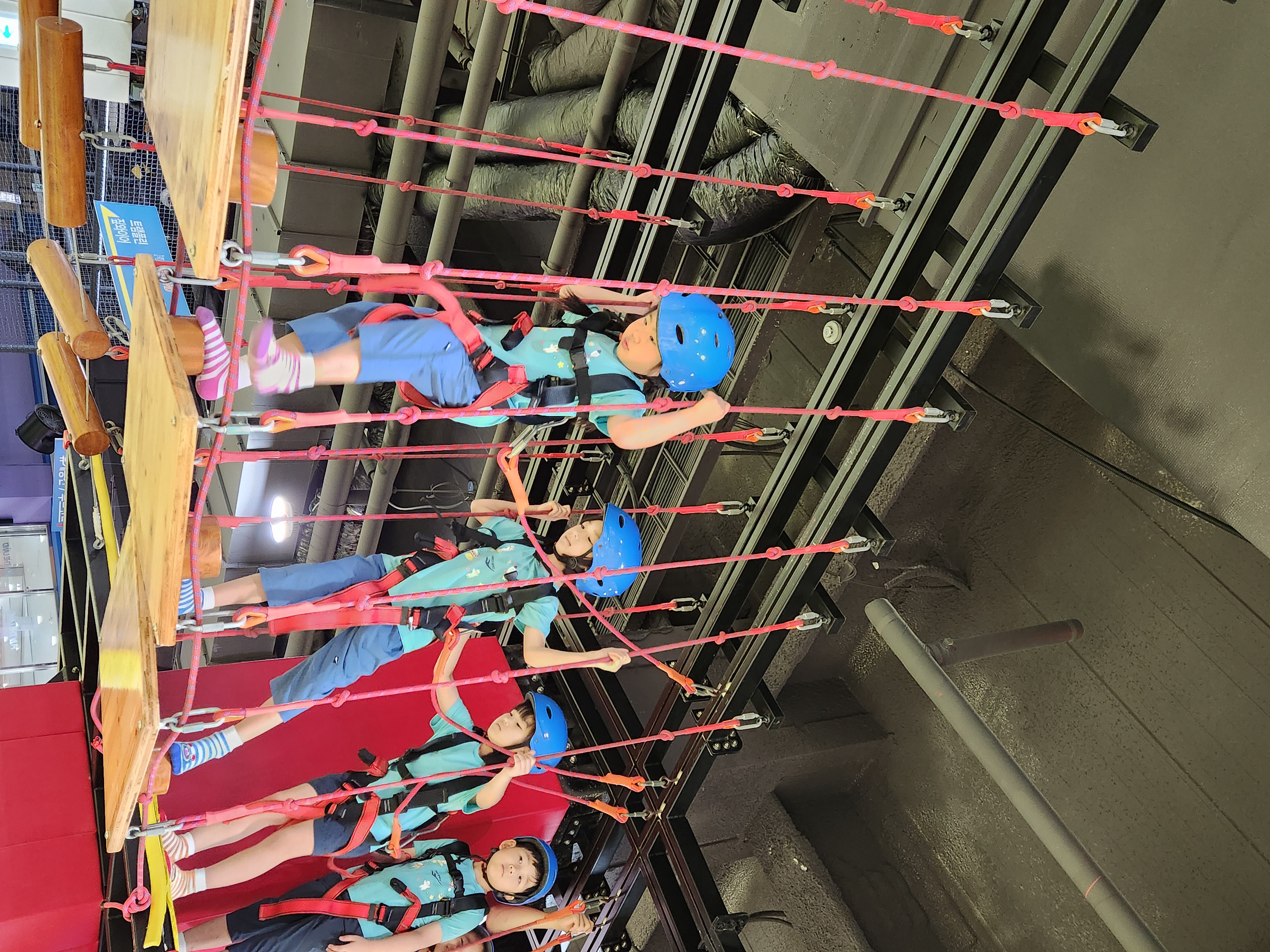 아이들은 먼저 짚 라인, 클라이밍, 로프코스 등 몸에 안전 로프 를 착용하고 아이들의 모험심과 담력을 길러주는 놀이를 하였다.