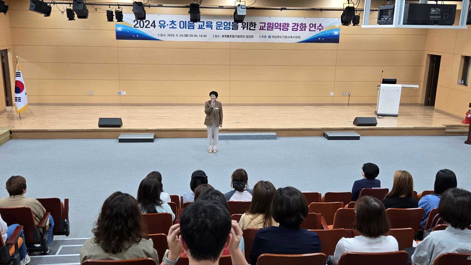 □ 경상북도안동교육지원청(교육장 안중환)은 9월 24일(화) 안동세계물포럼기념센터 대강당에서‘유·초 이음교육 운영을 위한교원 역량강화’라는 주제로 안동권역(안동, 의성, 영양) 유치원교사들을 대상으로 오전에는 방과후과정, 오후에는 교육과정 교사 연수를 하였다.