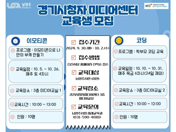 남양주시와 경기시청자미디어센터는 2019년 업무협약을 체결한 이후 4차 산업혁명에 대비한 미디어 교육을 꾸준히 제공하고 있으며 올해 3월부터 빅데이터, 코딩, 이모티콘, VR 콘텐츠 제작 등의 교육 과정을 운영하고 있다.