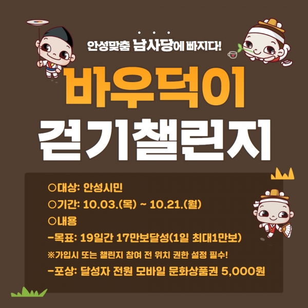 이번 챌린지는 안성시민을 대상으로 10월 3일부터 21일까지 19일간 17만보 달성을 목표로 진행되며 17만보 이상 달성한 참가자 전원에게 모바일 상품권 5,000원권을 증정한다.