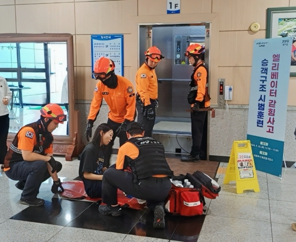 훈련은 정전으로 승강기가 멈춰 승객이 갇히는 사고 상황을 가정해 진행했다.