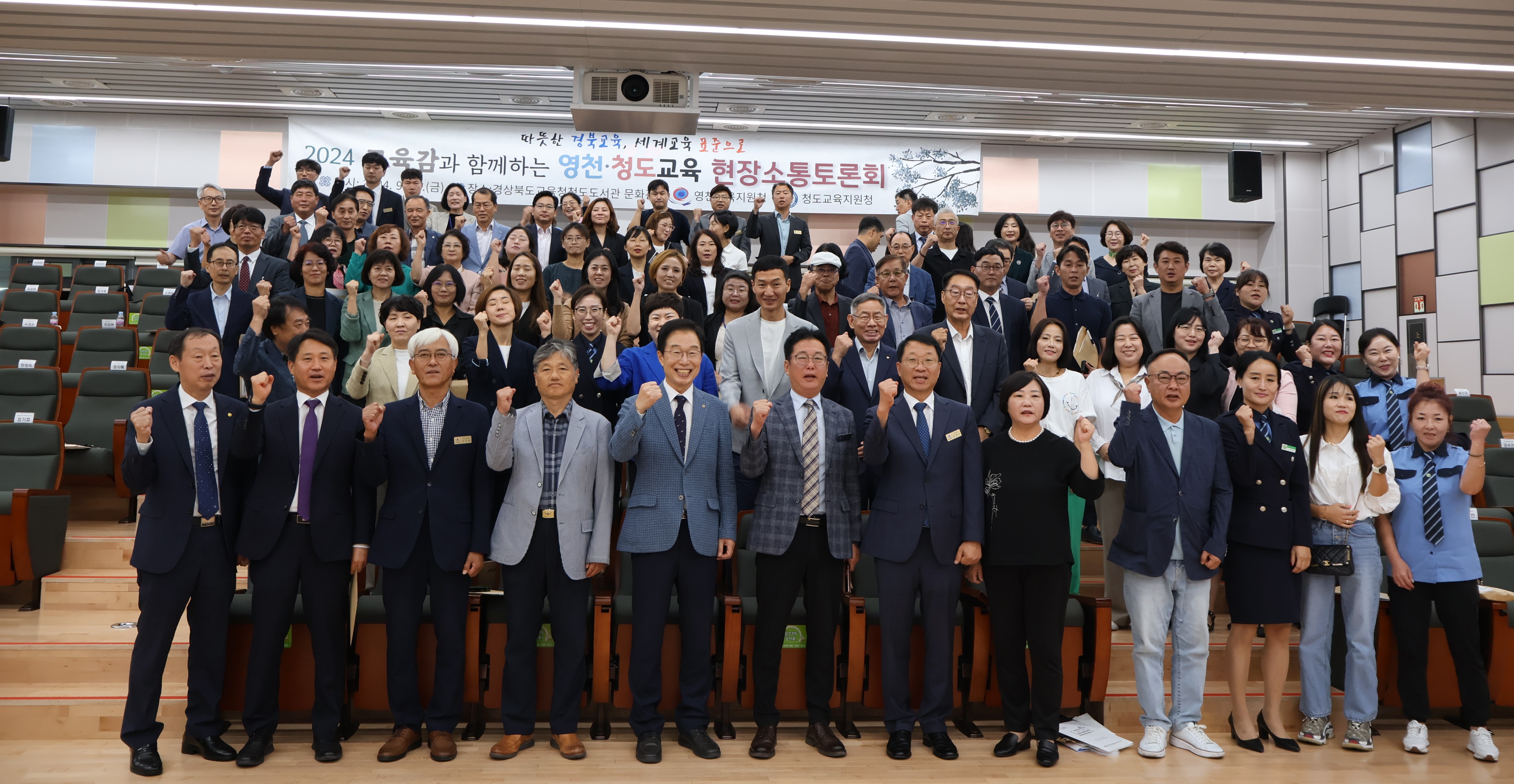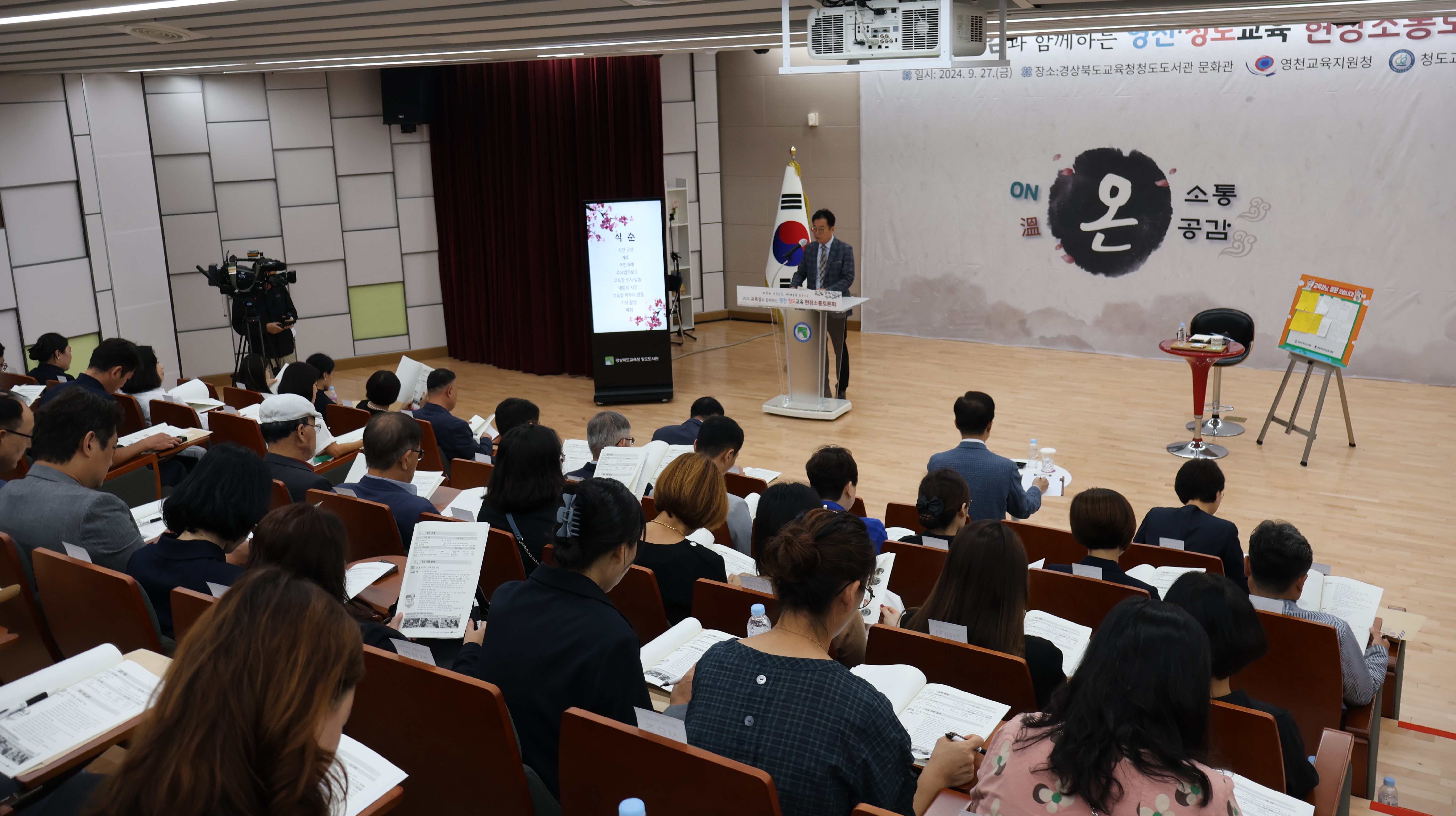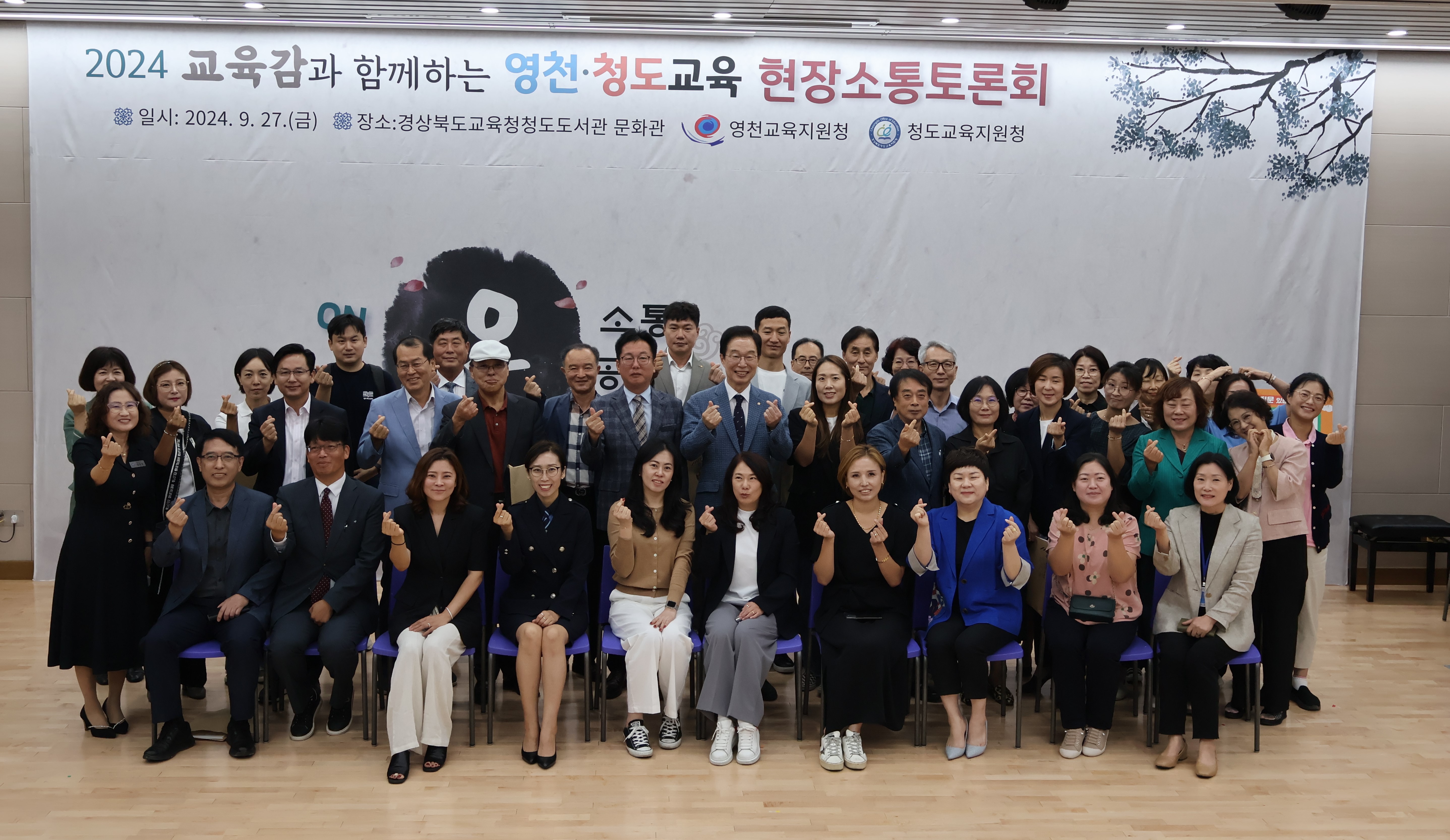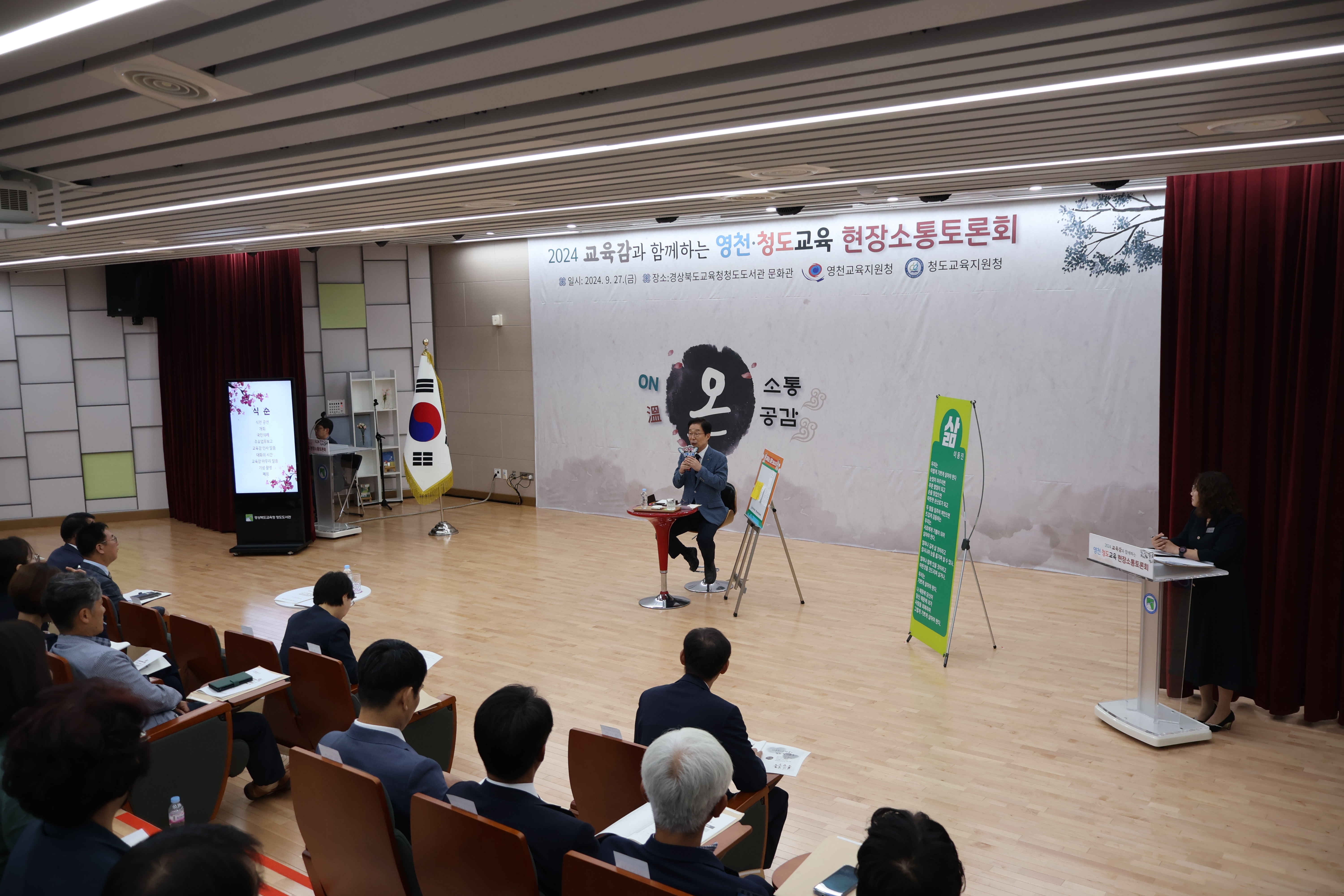 경상북도청도교육지원청(교육장 이시균)은 9월 27일(금), 청도도서관 문화관에서 ‘2024 교육감과 함께하는 영천·청도교육 현장소통토론회’를 개최했다. 이날 토론회에는 임종식 교육감, 경상북도의회 기획경제위원회 이선희 위원장, 청도군의회 전종률 의장, 그리고 영천·청도지역 교육장, 학부모, 교육가족 100여명이 참석했다.