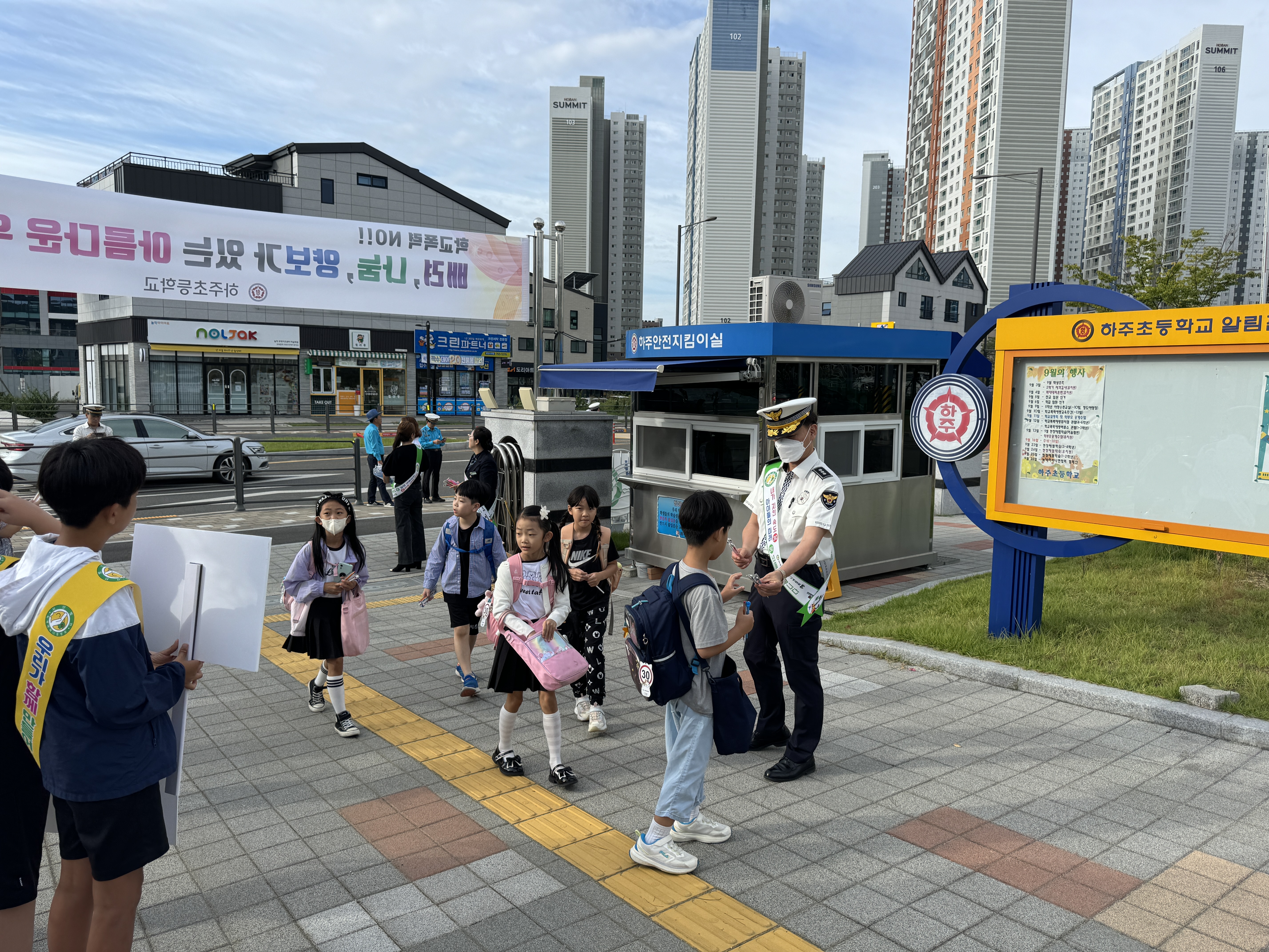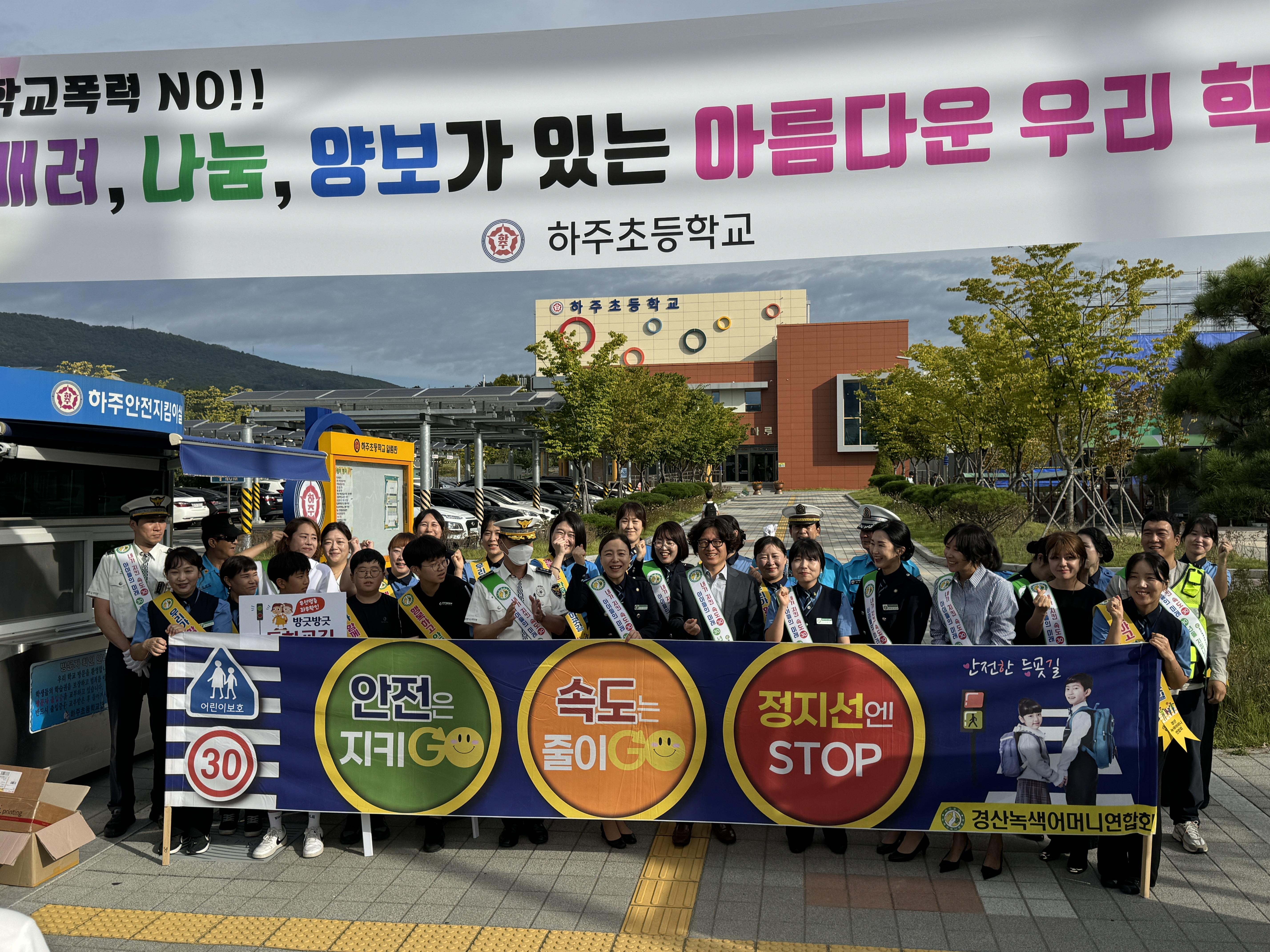 □ 하주초등학교(교장 이상수)가 지난 9월 26일 어린이들의 안전한 등굣길 조성을 위해 학생회 임원, 교사, 녹색학부모회, 경찰 및 모범 운전사들과 함께 교통안전 캠페인을 진행하였다.