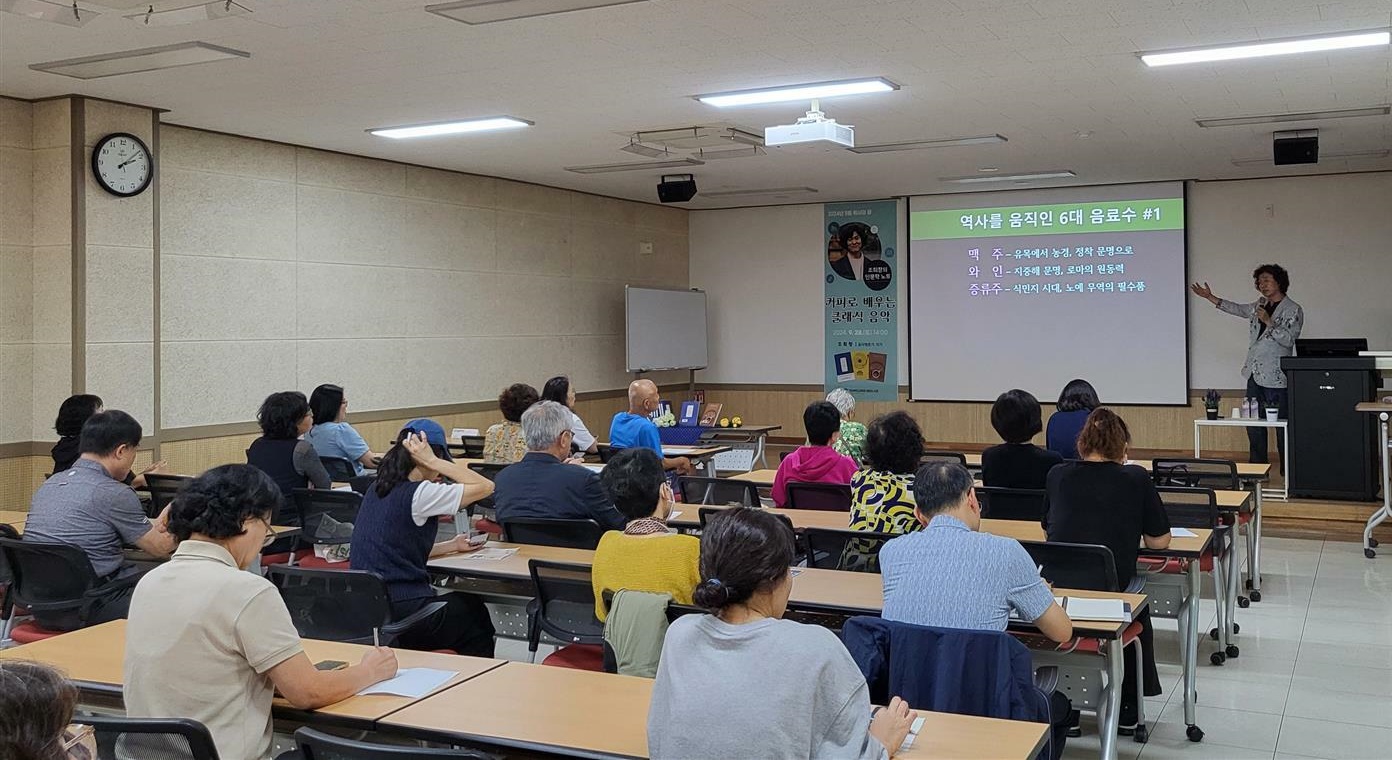 □ 이번 특강은 ‘커피로 배우는 클래식 음악’이라는 주제로 진행되었으며, 조희창 작가는 커피의 역사와 함께 클래식의 흐름을 통해 지역주민들이 깊이 있는 이해를 할 수 있도록 돕는 강연을 진행했다.