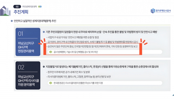 GH 관계자는 이날 토론회에서 문제가 제기되자 주민들이 원한다면 소통할 수 있다는 의미며 문구가 과하게 나온 것 같다며 “절대로 민간인 사찰처럼 주민들 동향을 파악하고 보고하고 관리하는 그런 내용이 아니다”며 적극적으로 해명하는 모습을 보여줬다.