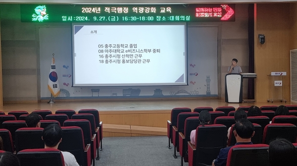 이번 교육은 공무원들의 적극행정에 대한 이해도를 높이고 적극행정 마인드를 고취하기 위한 교육으로 ‘충주맨’ 으로 유명한 김선태 주무관을 강사로 초청했다.