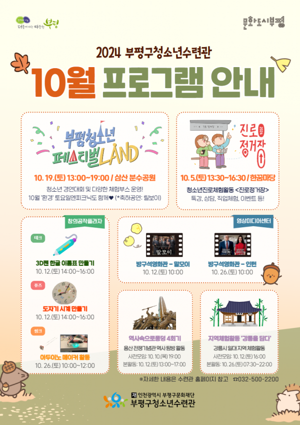 부평구청소년수련관, 10월 맞아 다양한 청소년 프로그램 운영