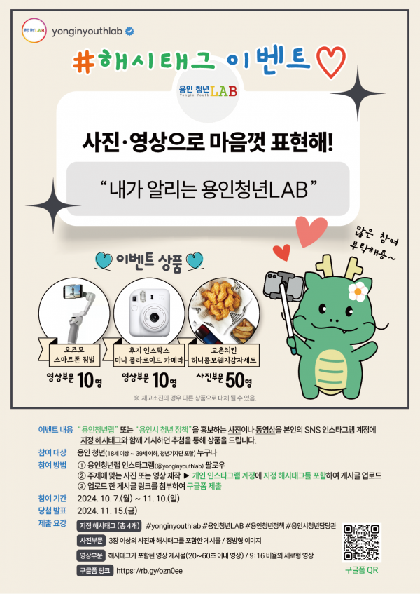 영상은 사진과 동일하게 ‘용인청년LAB’ 이나 용인특례시의 청년 정책과 관련된 20~60초 이내의 영상을 제작해 개인 계정에 게시하면 참여할 수 있다.