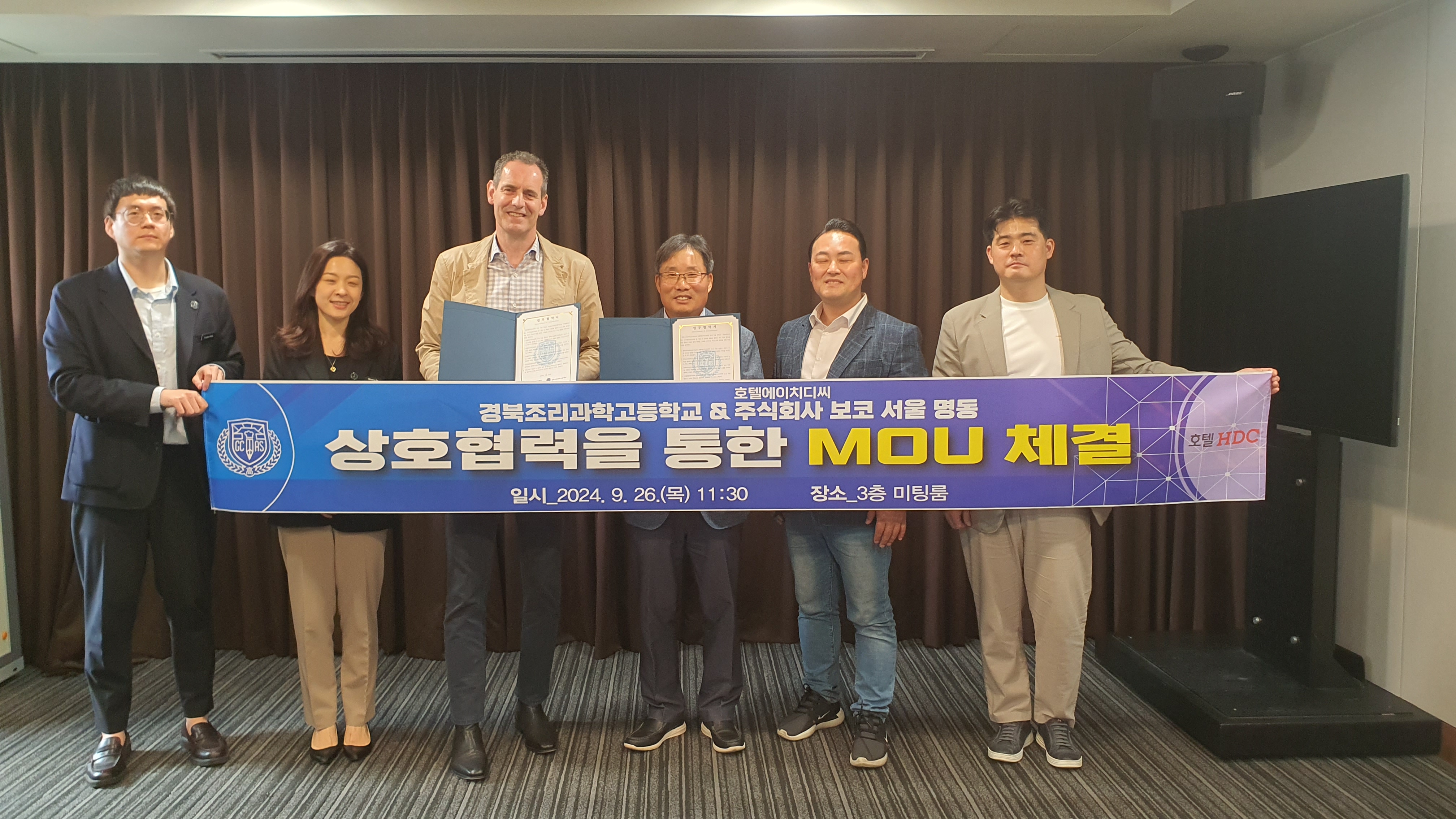 □ 경북조리과학고등학교(교장 고시환)은 지난 26일 현대산업개발에서 운영하는 특급호텔인 보코 명동호텔과 MOU 협약을 체결했다. 이번 협약은 취업 지원을 위한 상호 협력 목적으로 이루어졌으며, 현장실습과 취업에 참여하는 학생들에게 보다 넓은 외식업계에 발을 딛게 된다.