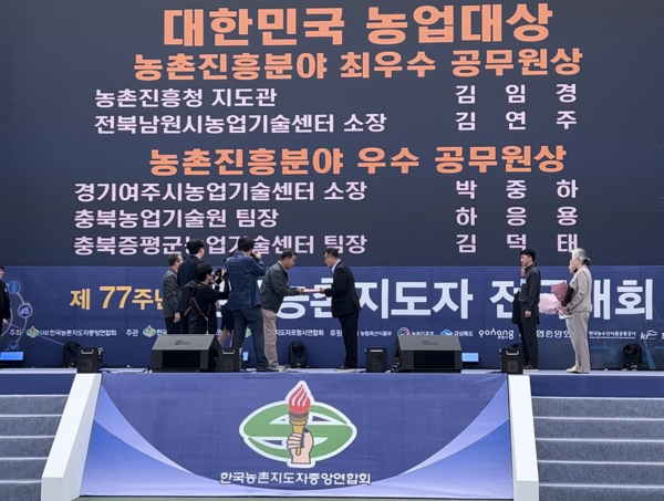 이날 수상한 대한민국 농업대상에서는 전국 농업관련 공무원 중 5명을 선발해서 수여하는 농촌진흥분야에서 박중하 농업기술센터소장이 공로를 인정받아 수상했으며 농업인분야에서는 서재호 직전회장이 수상하는 겹경사를 맞았다.