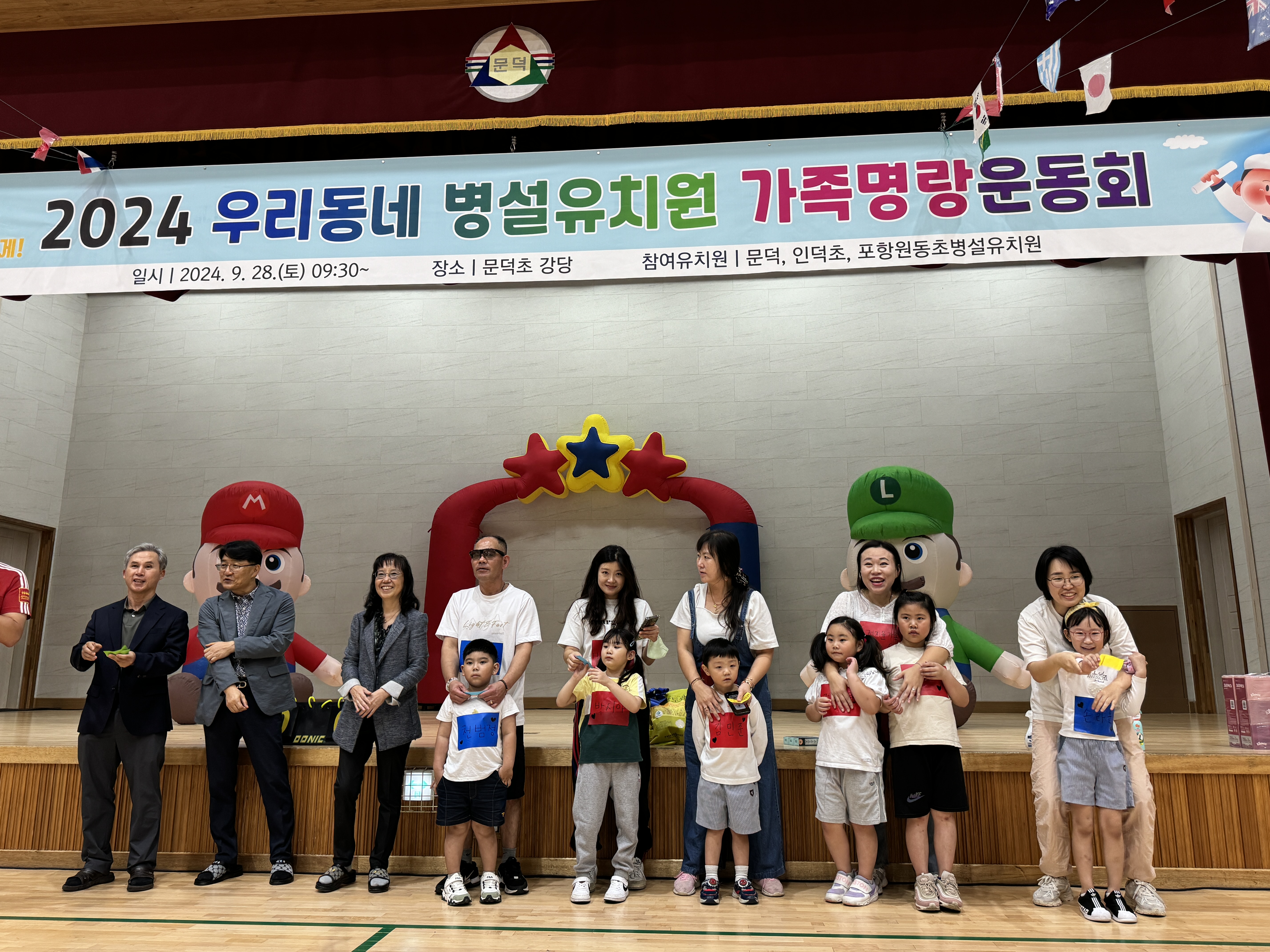 인덕(원장 정미정), 포항원동(원장 손진수), 문덕초등학교 병설유치원(원장 문석주)이 합동하여 9월 28일 (토) 문덕초등학교 강당에서 전체 유아와 가족들을 대상으로 ‘우리 동네 병설유치원 가족 명랑 운동회’를 실시하였다.