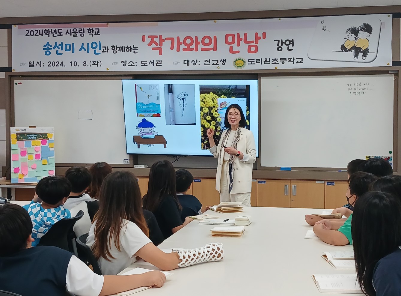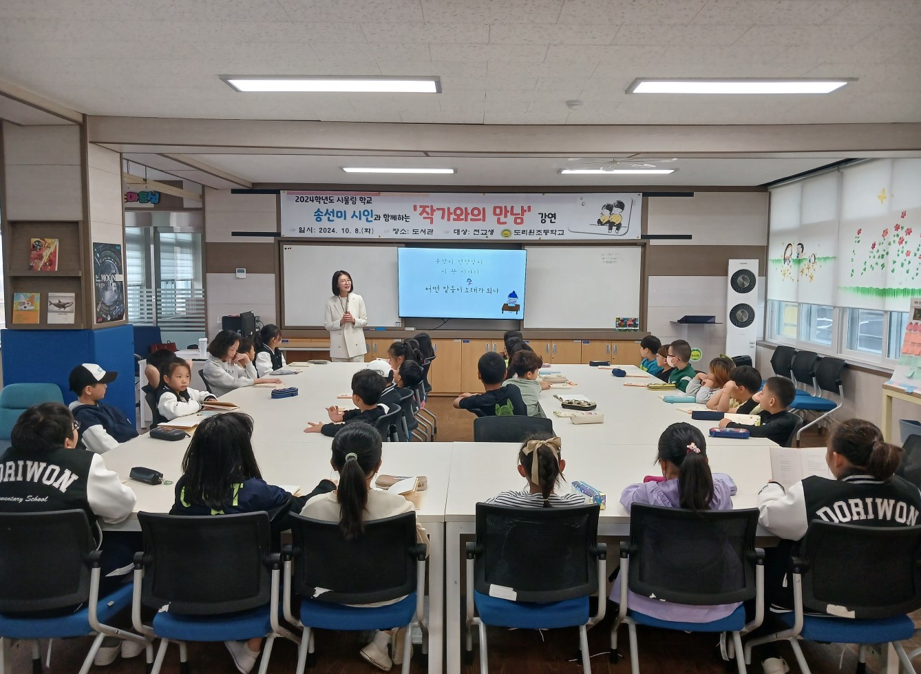 의성 도리원초등학교(교장 김세효)는 가을 독서의 달을 맞아 8일(화) 송선미 시인과 함께하는 ‘작가와의 만남’ 프로그램을 전교생을 대상으로 운영했다. 이번 프로그램은 학생들의 표현력과 예술적 감수성을 함양함과 동시에 학생들이 다양한 경험을 통해 느낀 생각과 감정을 시로 표현해 보기 위해 마련되었다.