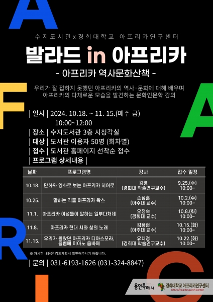 수지도서관은 평소 접하기 힘든 아프리카 문화와 역사를 알아보기 위해 경희대 아프리카 연구센터와 협업해 이번 강연을 마련했다.
