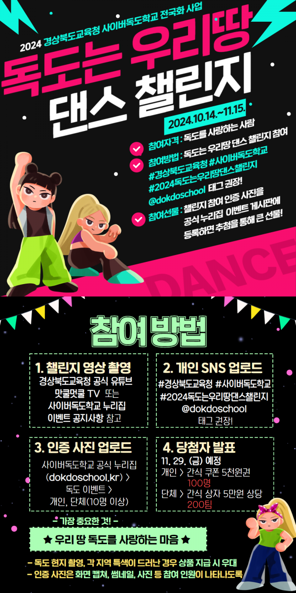 ‘독도는 우리 땅 댄스 챌린지’는 사이버독도학교 누리집에 게시된 영상을 참고해 챌린지 영상을 촬영하고 개인 SNS에 올린 후 인증 사진을 이벤트 게시판에 등록하는 방식으로 진행된다.